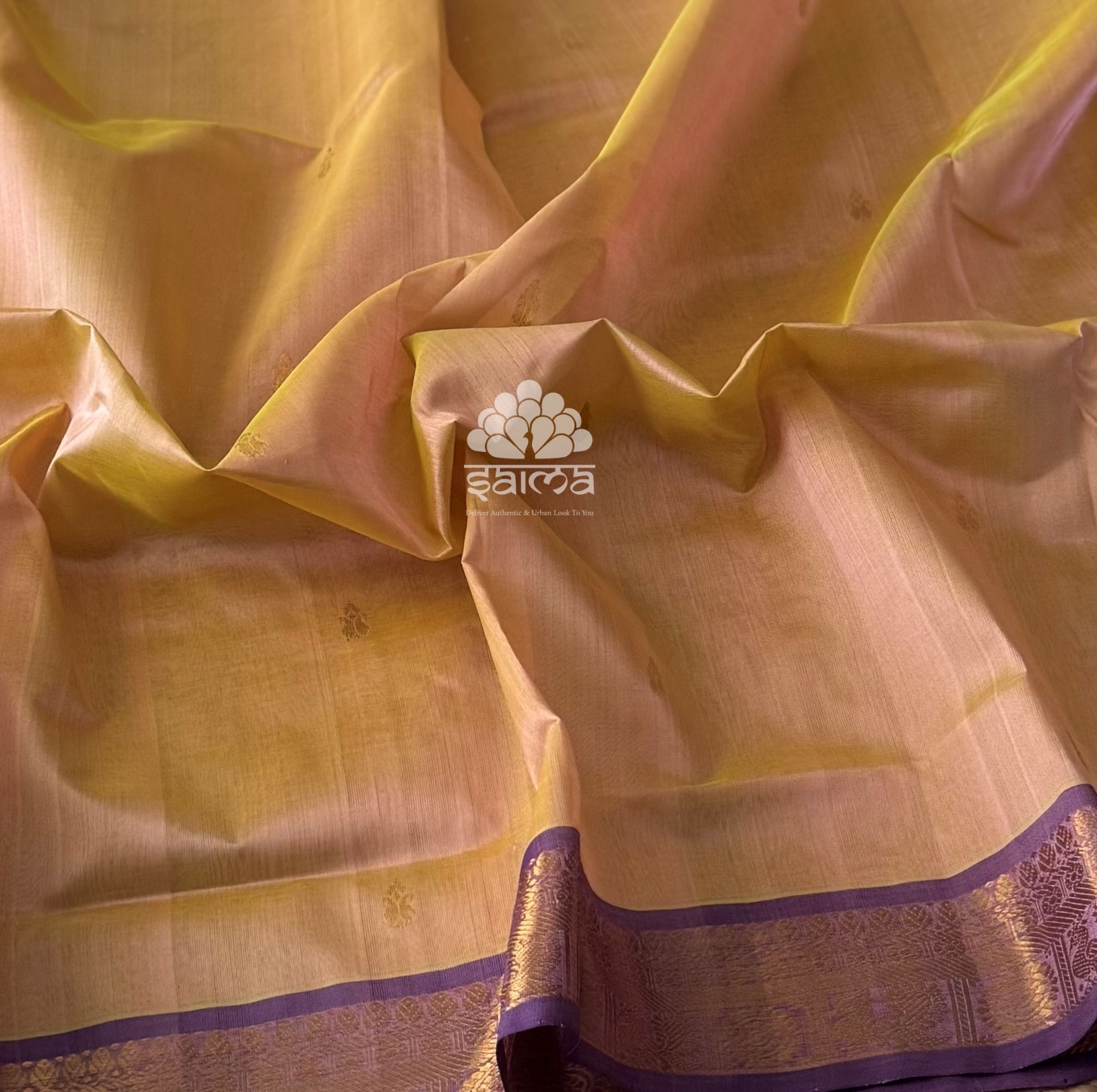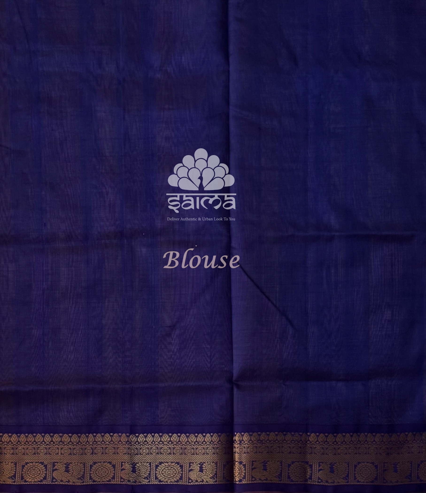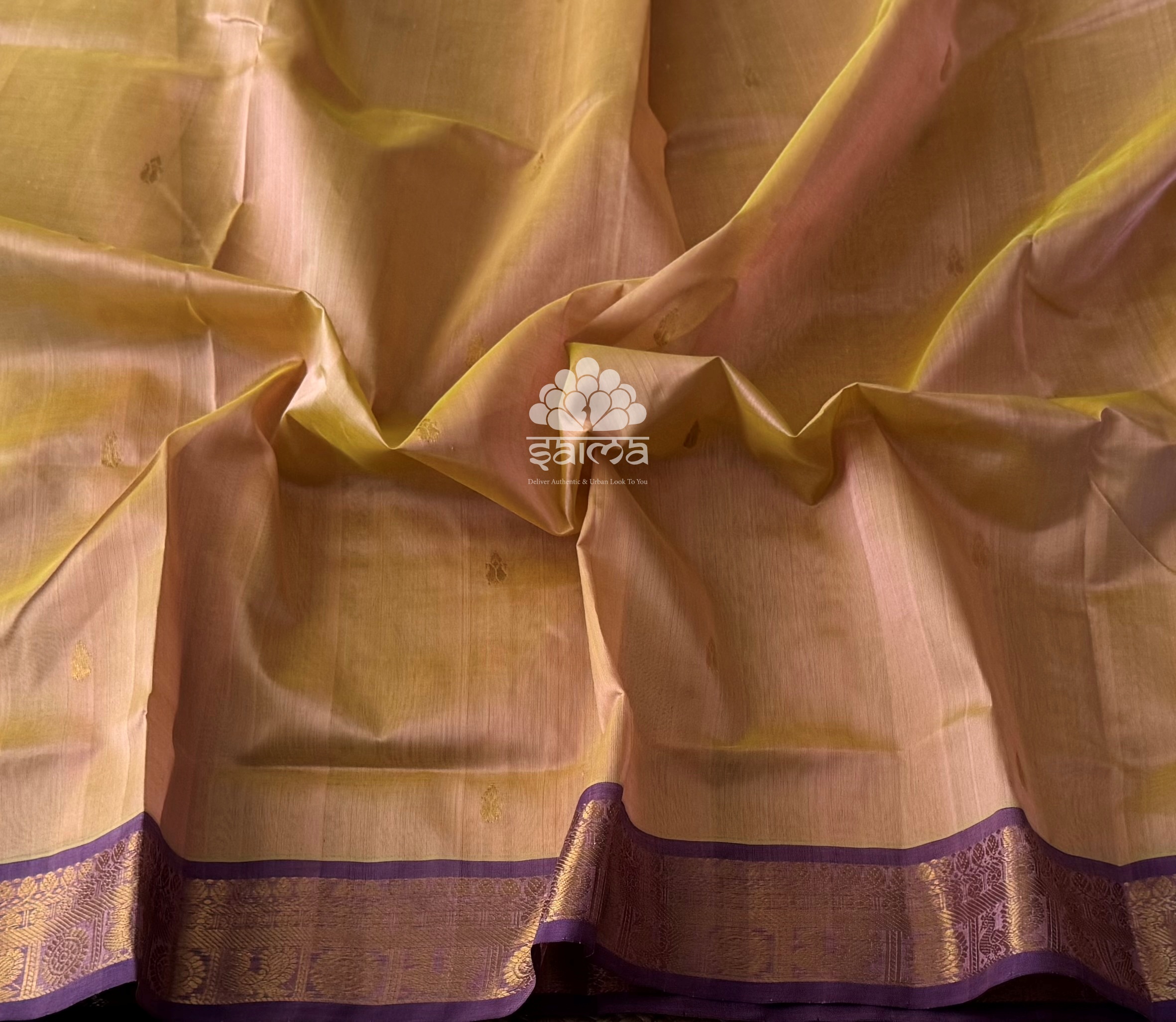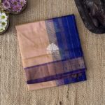 Kanchi silk cotton in champagne blush shaded color having small bhuttas design and annapakshi and chakra design border. Pallu and blouse in ink blue color.