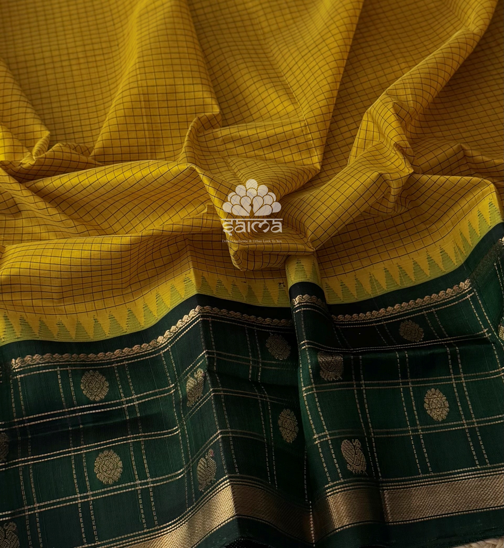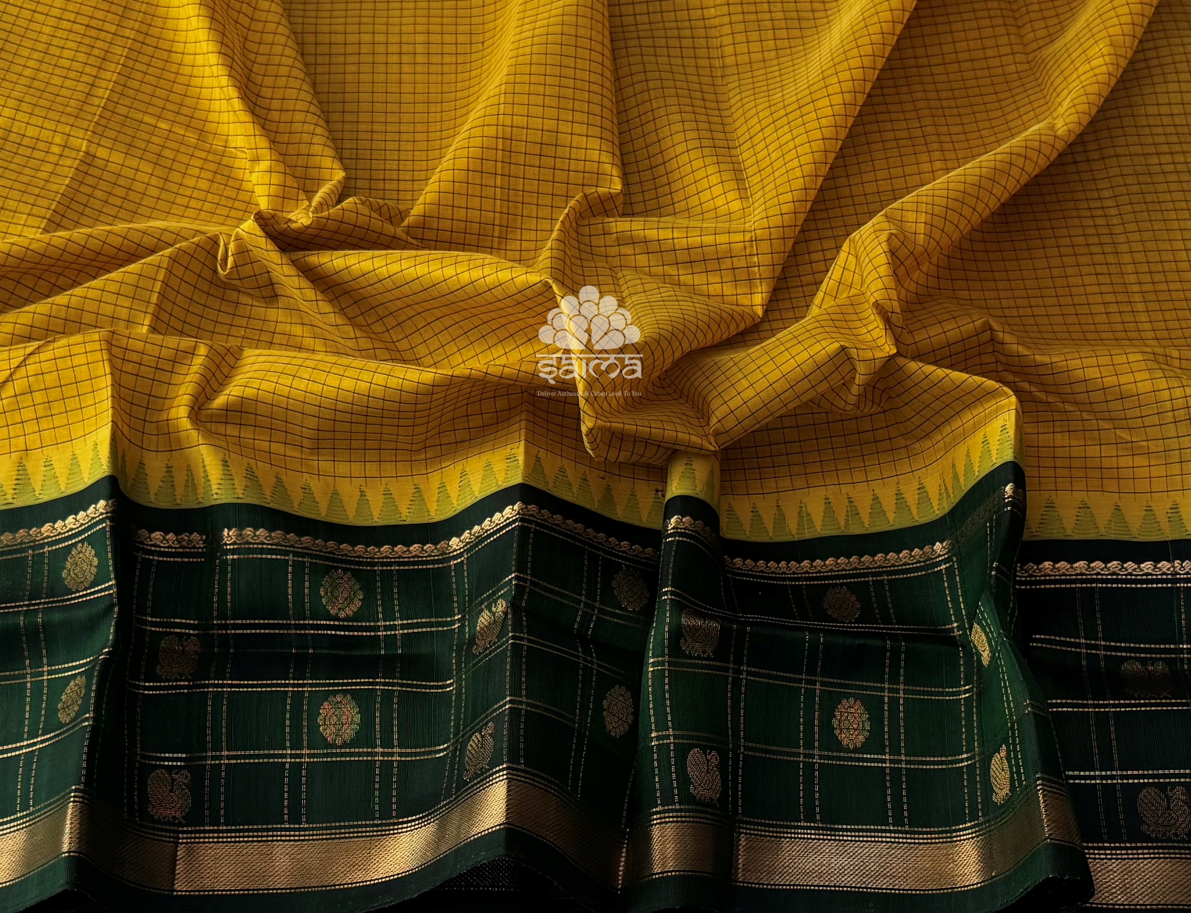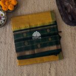 Kanchi korvai silk cotton in antique mustard yellow color having fine checks all over the saree and small temple design with zari kattam floral bhuttas rich lower korvai border. Pallu and blouse in dark green color.