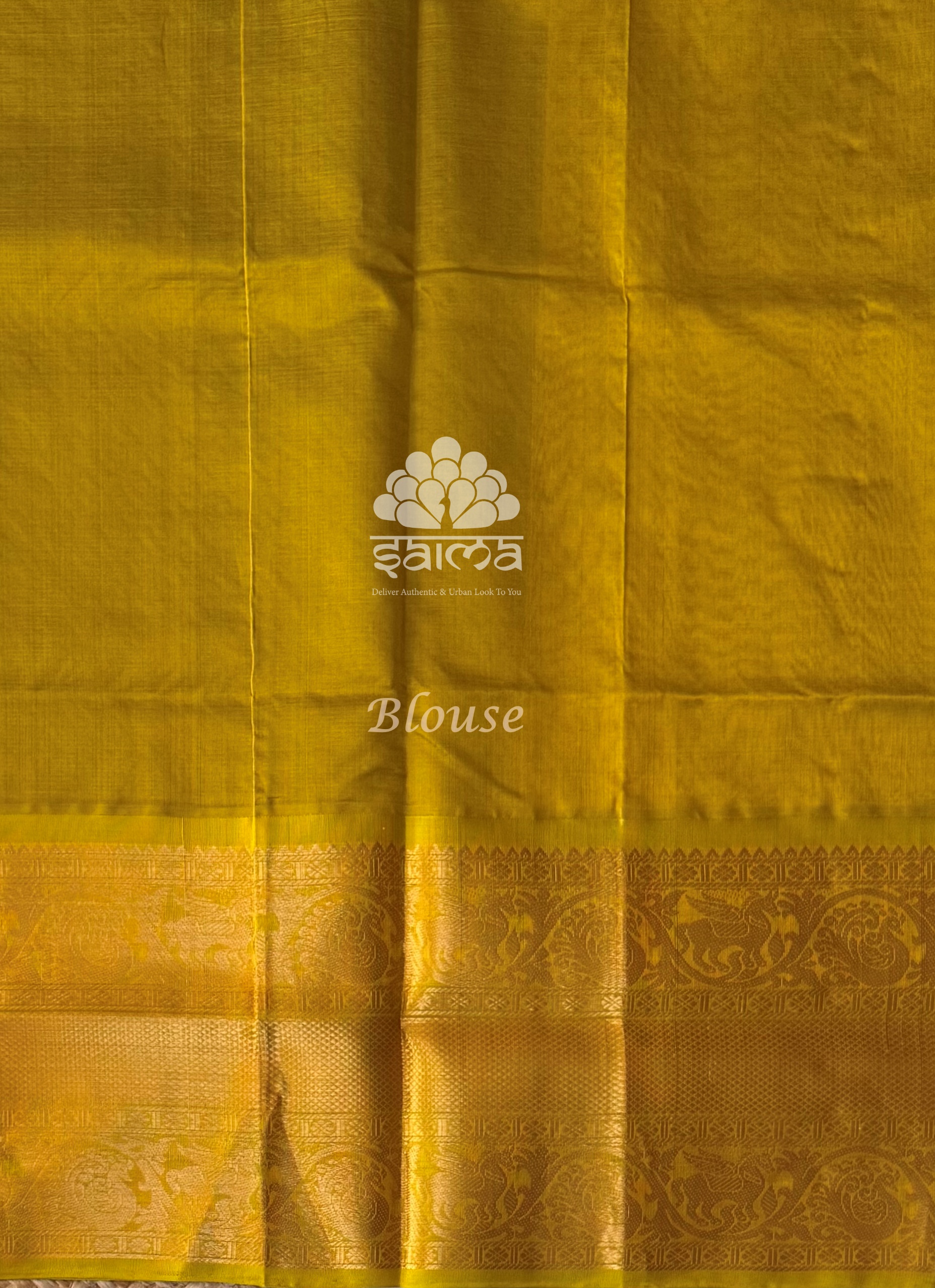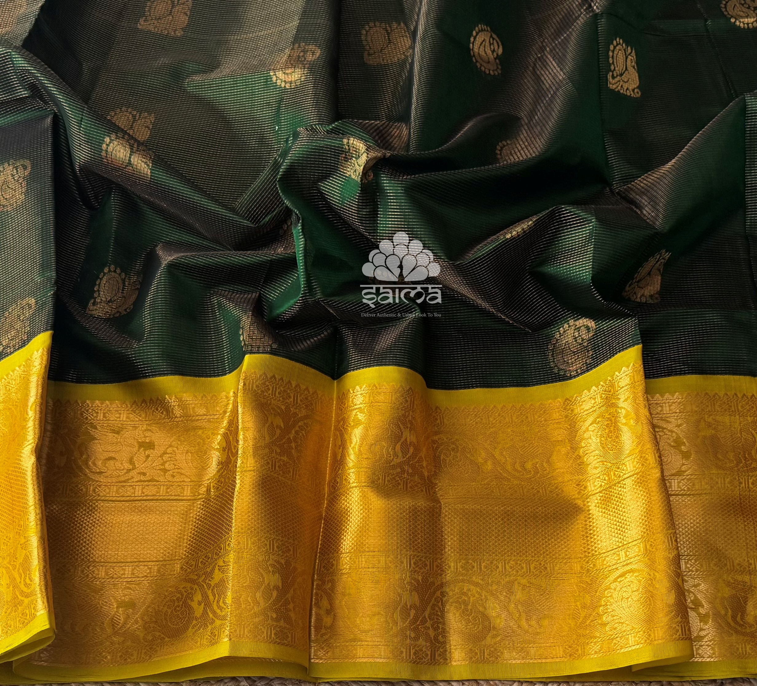Kanchi korvai silk cotton in a dark green color having zari kattam with bhuttas design and grand designed korvai border. Pallu and blouse in dark lemon yellow color.
