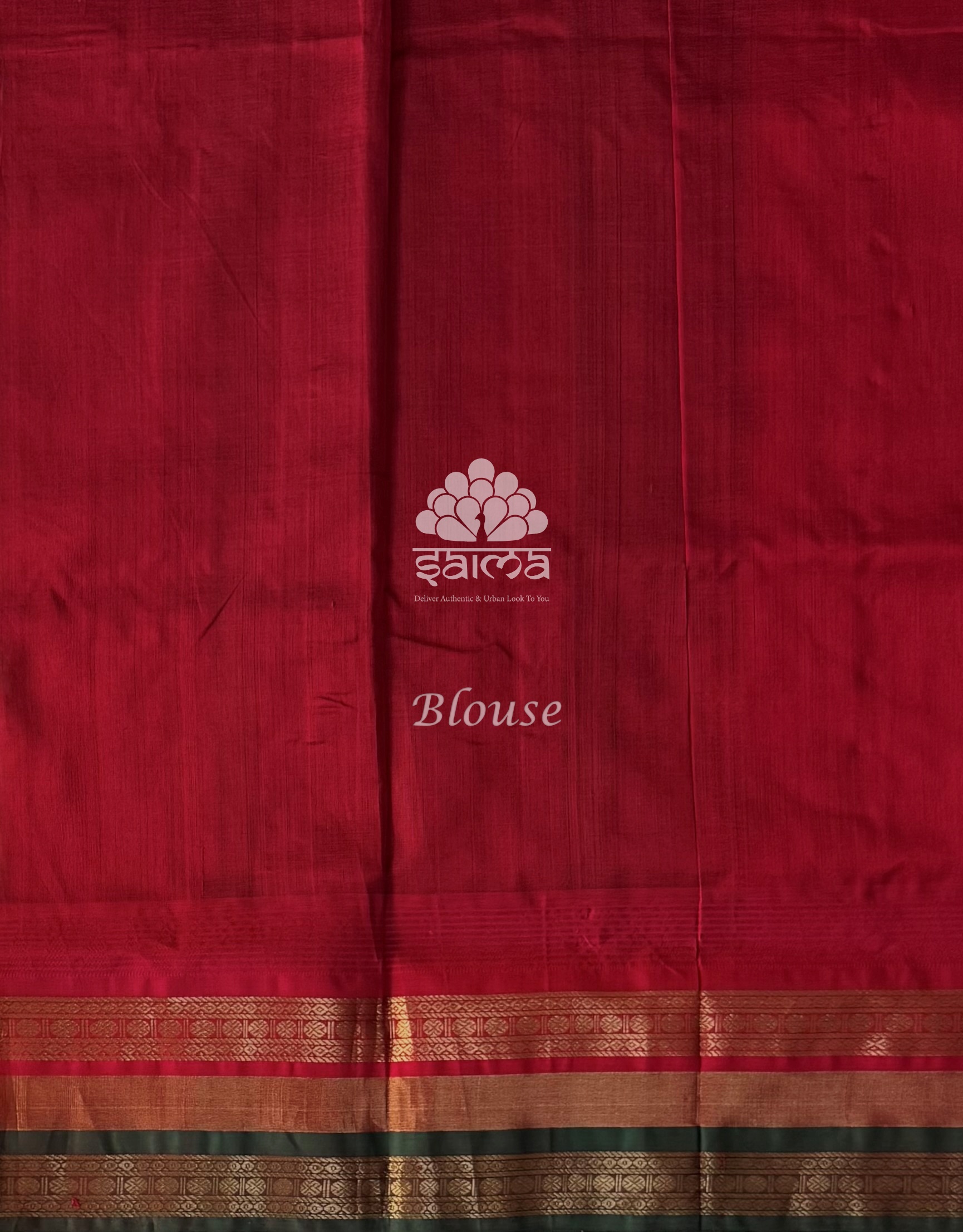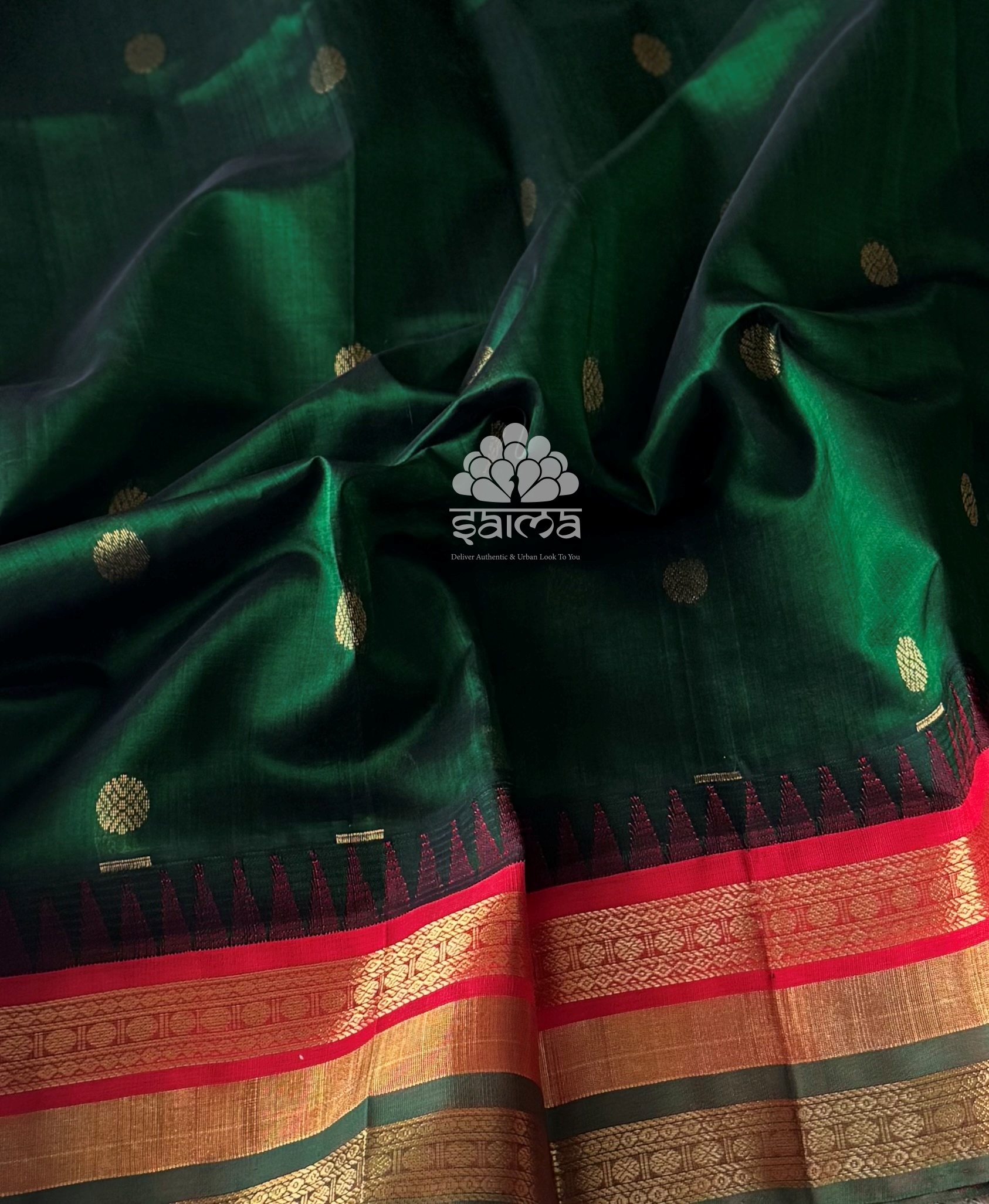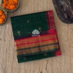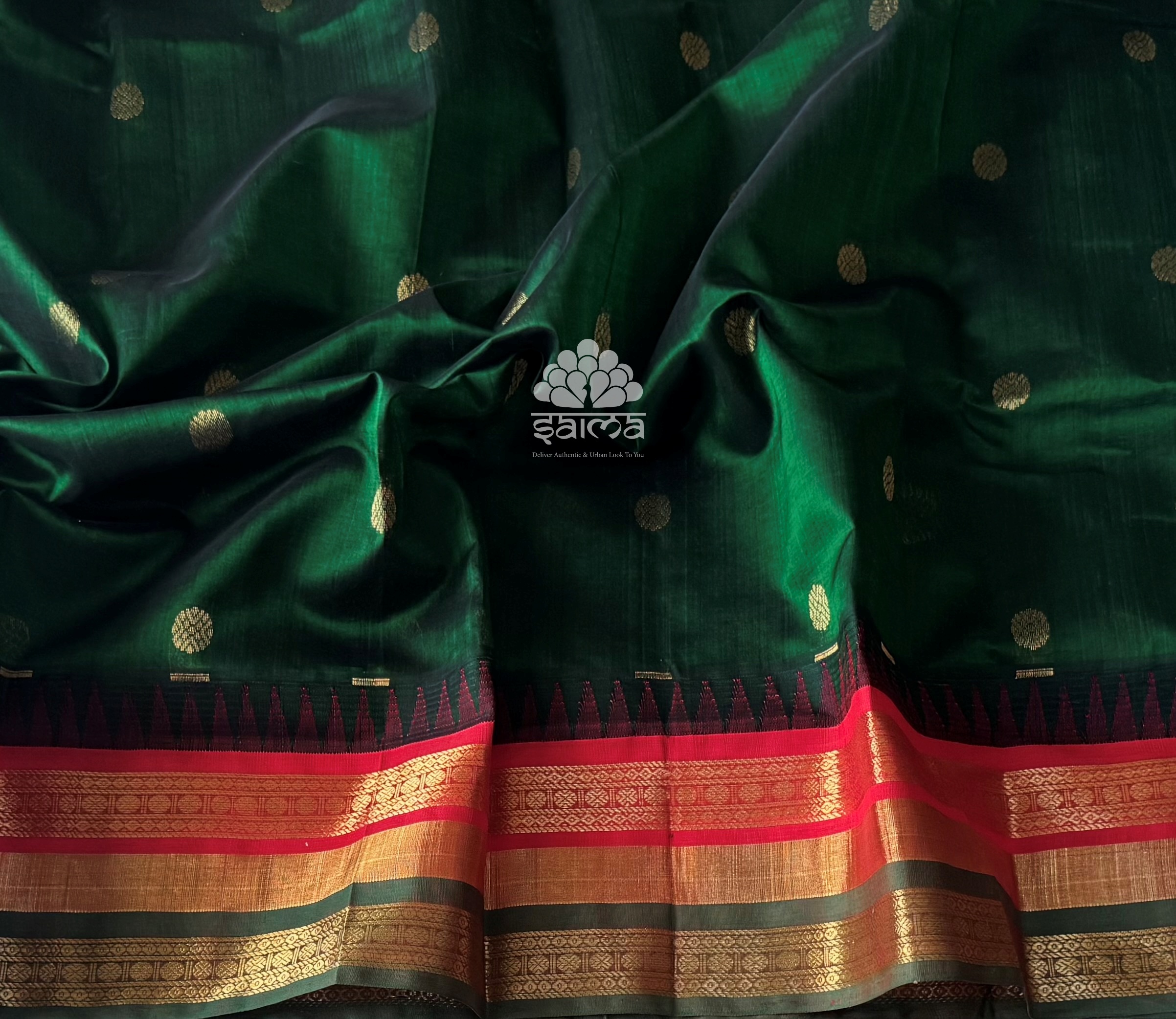 Kanchi korvai silk cotton in dark green color having chakra bhuttas all over the saree and rich designed korvai border. Pallu and blouse in red color.