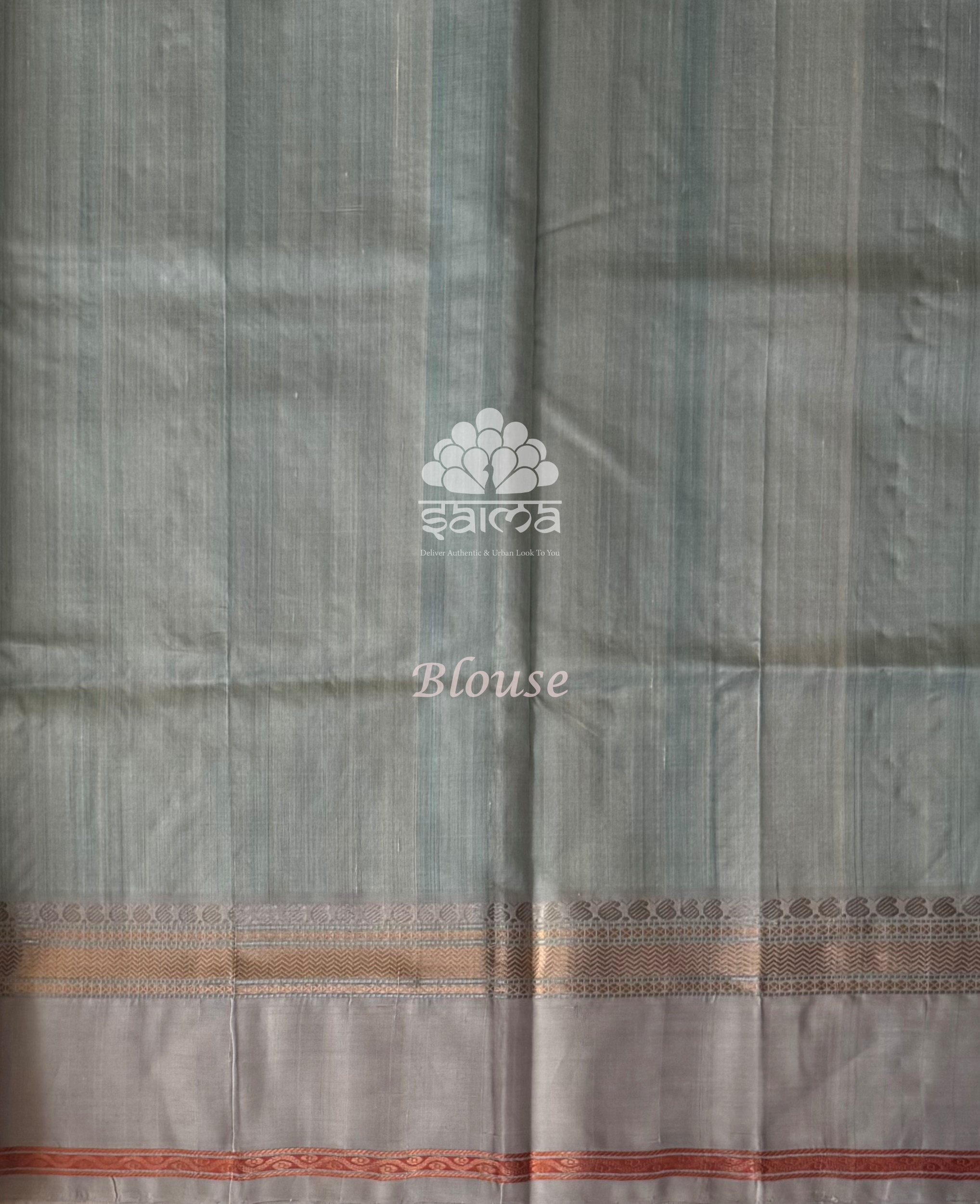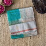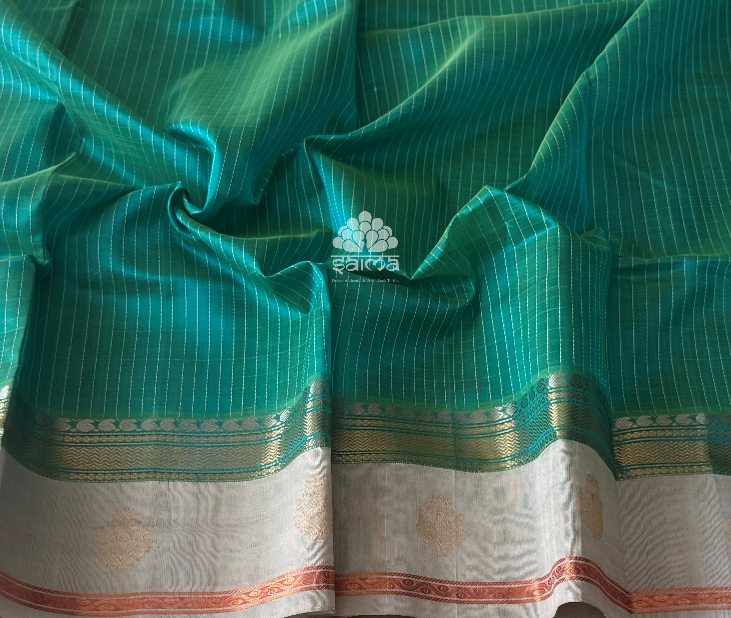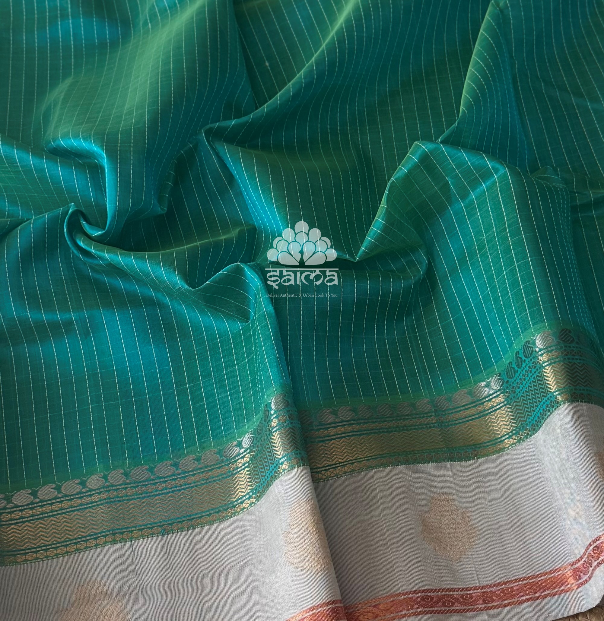 Kanchi silk cotton in lagoon blue having thread kattam design all over saree and thilak design bhutta with zari designed lower korvai border and simple zari designed korvai . Pallu and blouse in warm dove grey color.