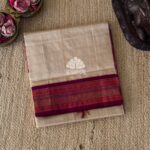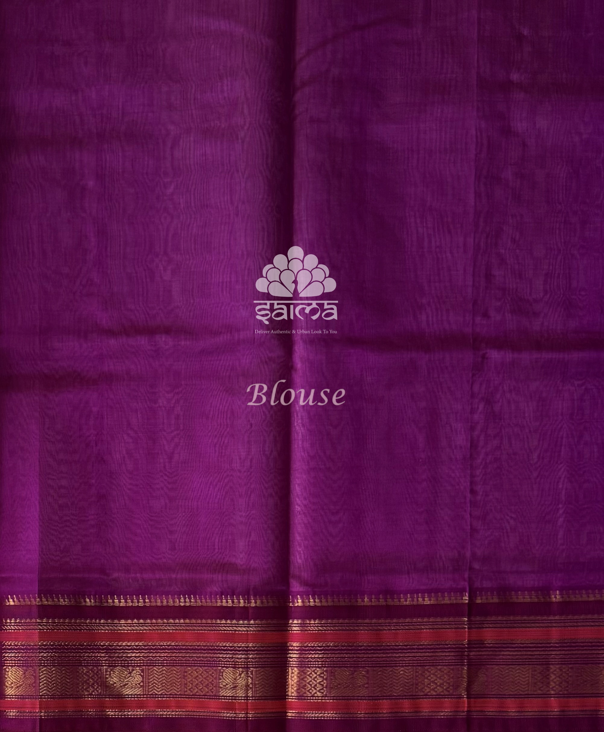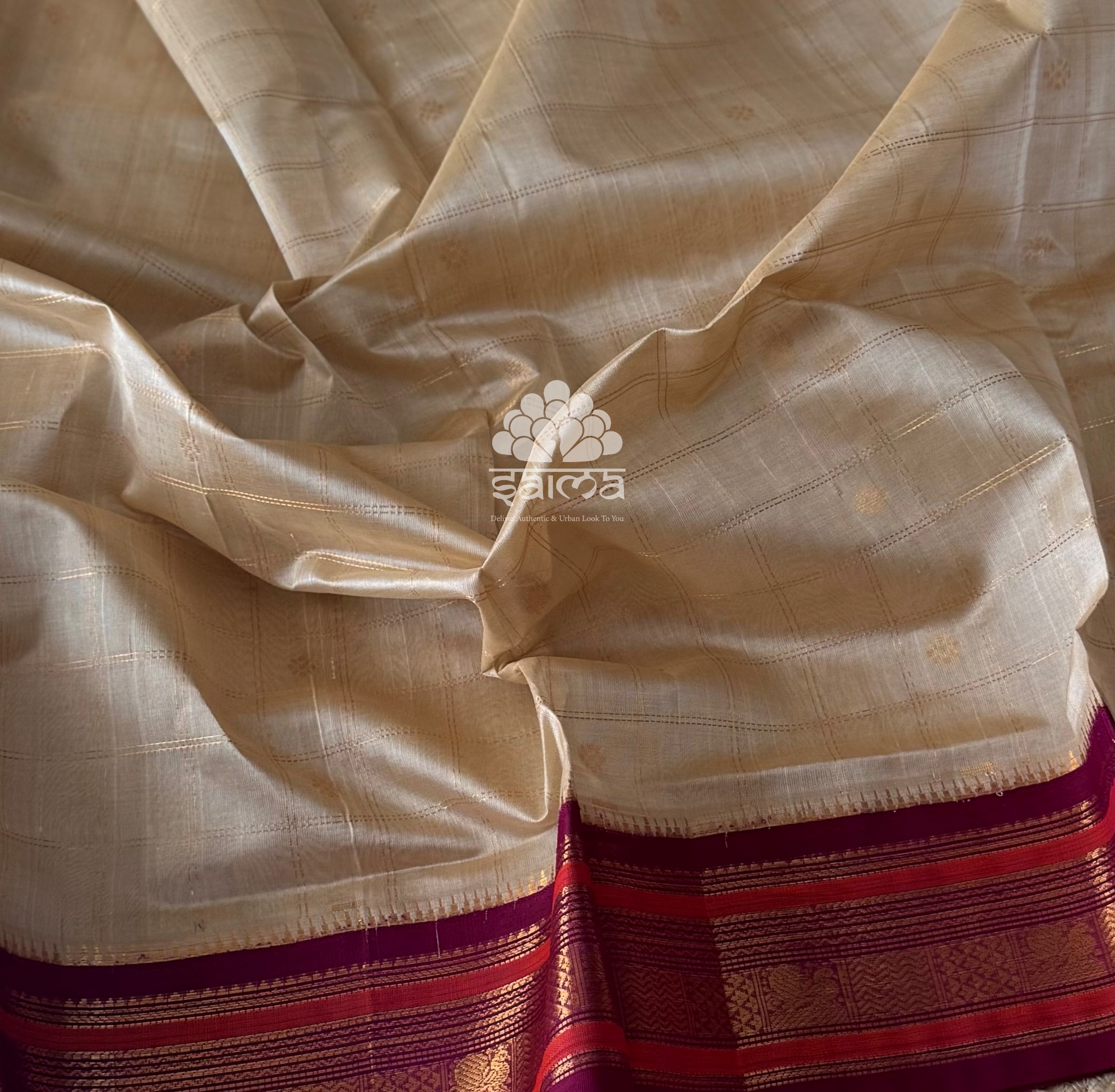 Kanchi korvai silk cotton in ivory beige color having zari kattam with bhuttas design and annapakshi design korvai border. Pallu and blouse in magenta-purple color.