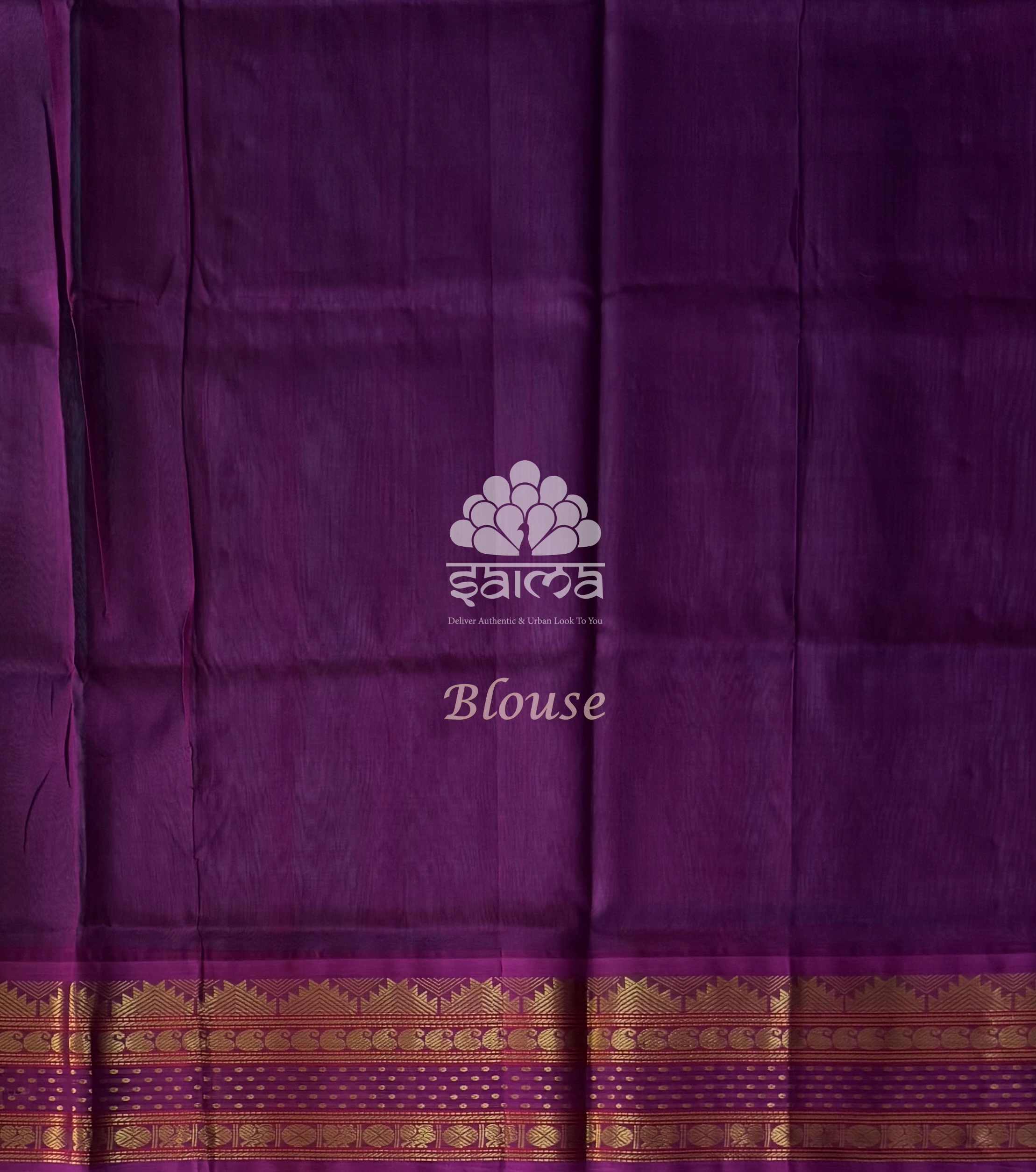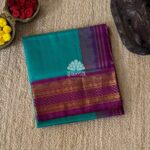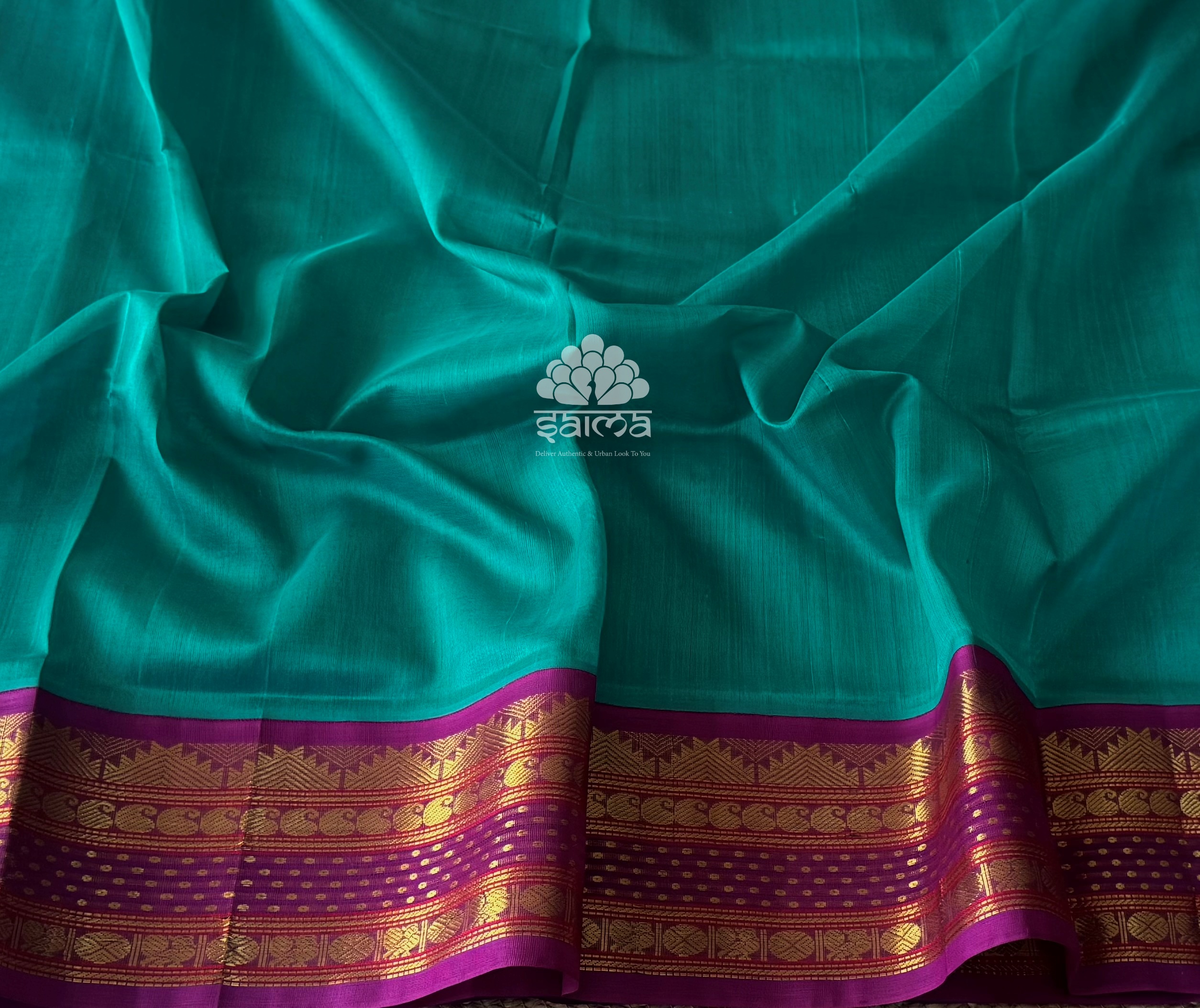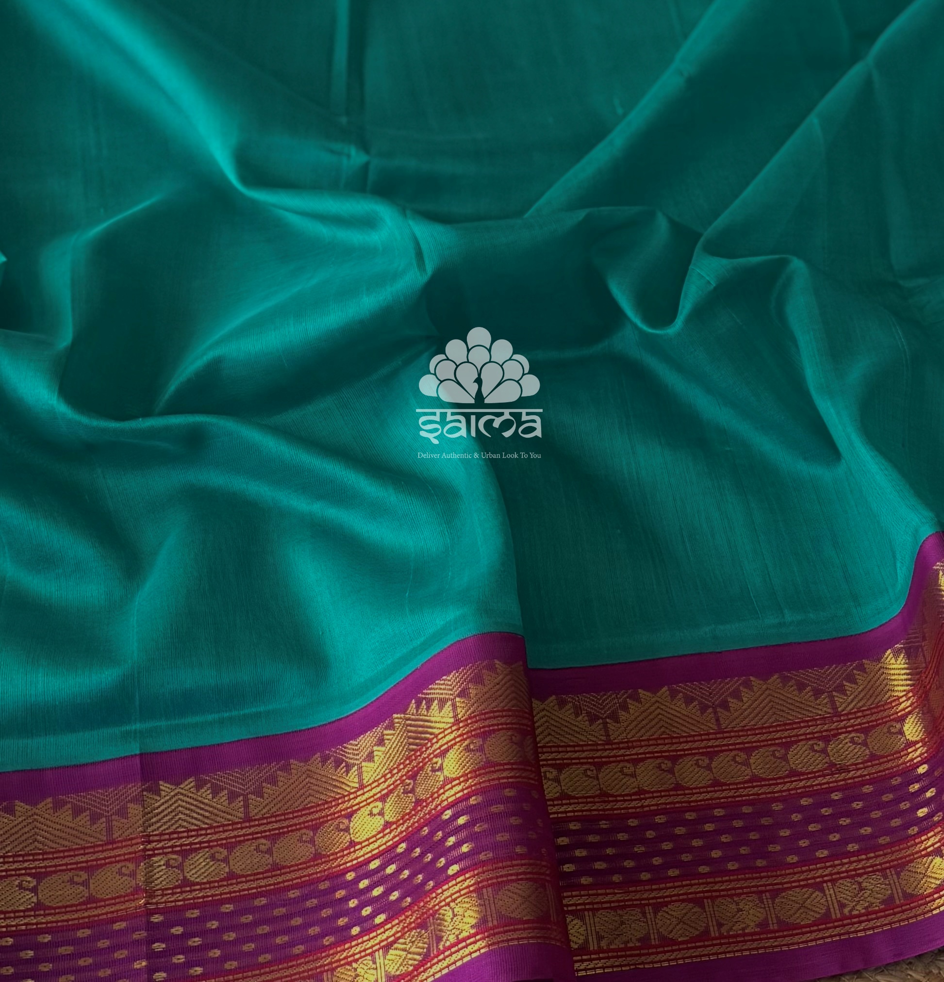 Kanchi korvai silk cotton in deep aqua blue having plain design and rich mango and zari bhuttas design korvai border. Pallu and blouse in magenta purple color.