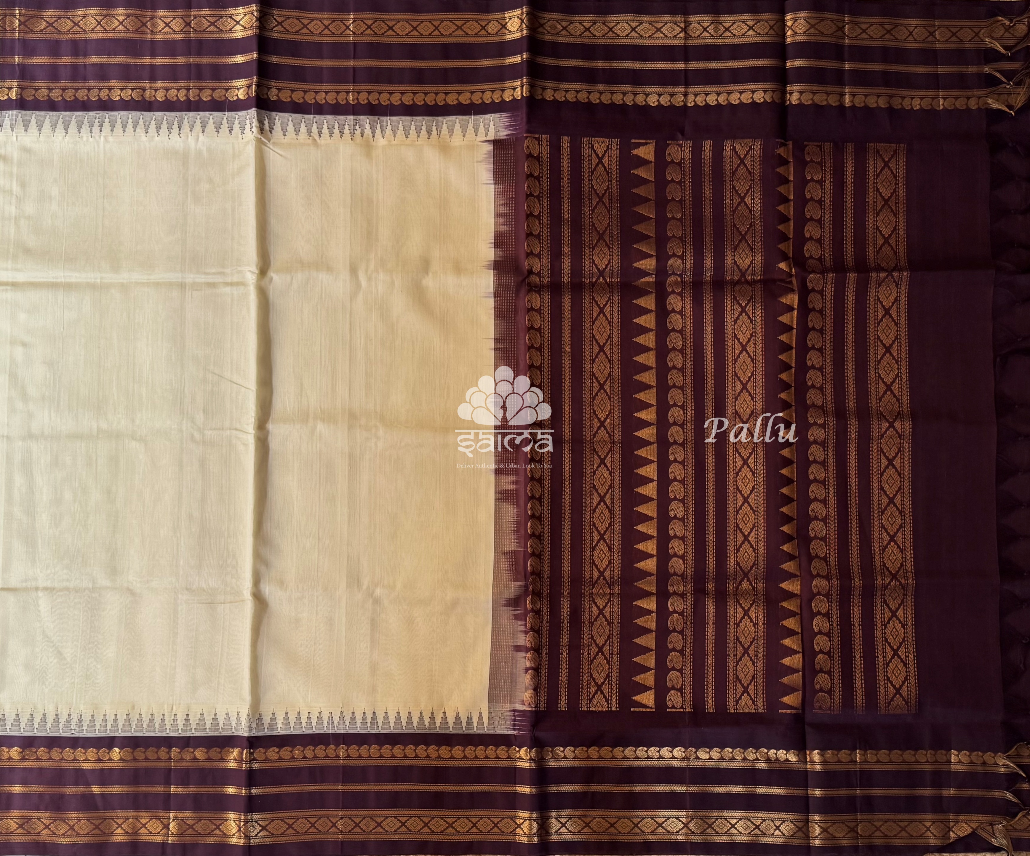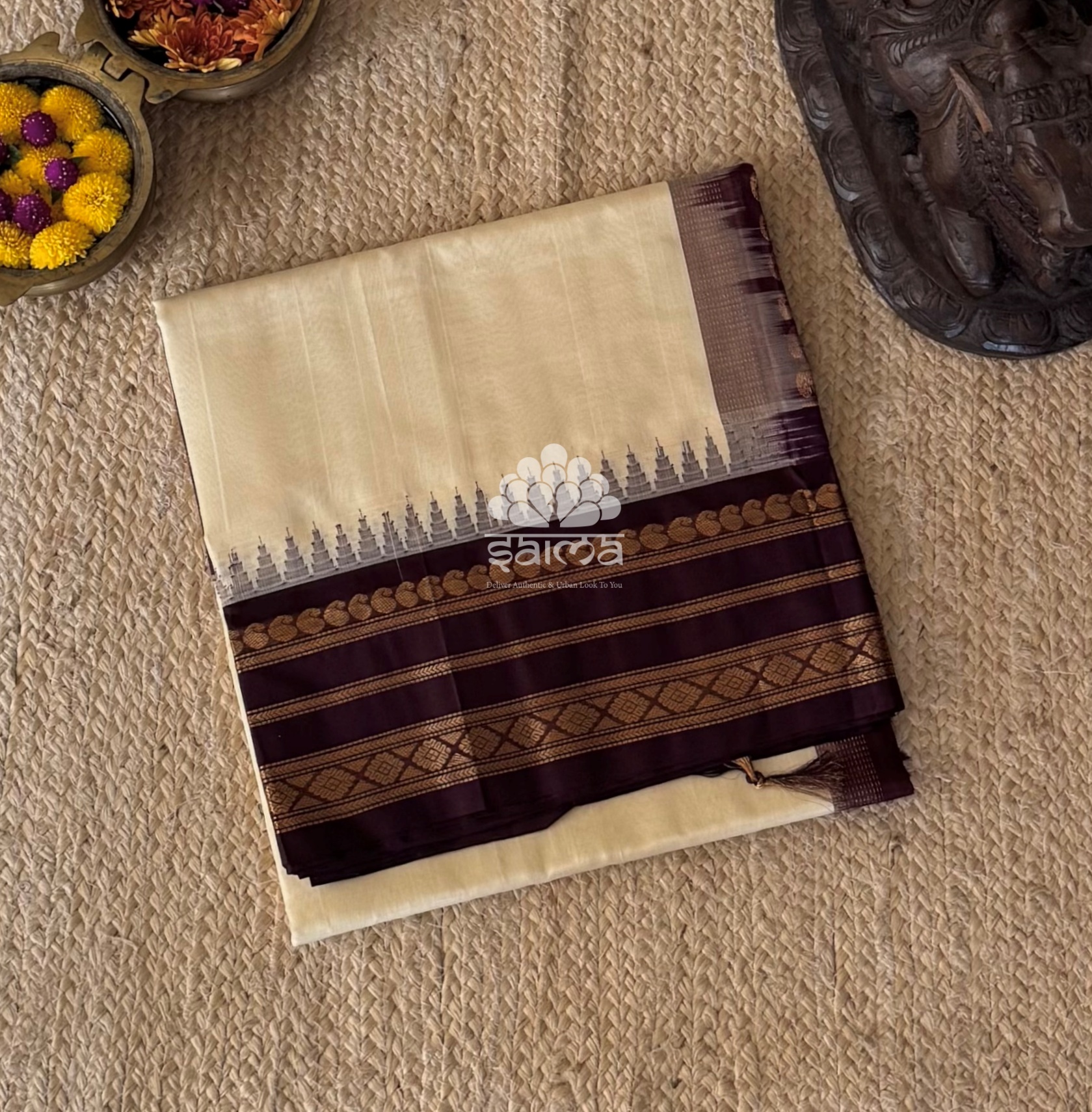 Kanchi korvai silk cotton in a rare color espresso brown having plain design and floral and polka designed korvai border. Pallu and blouse in off white color.