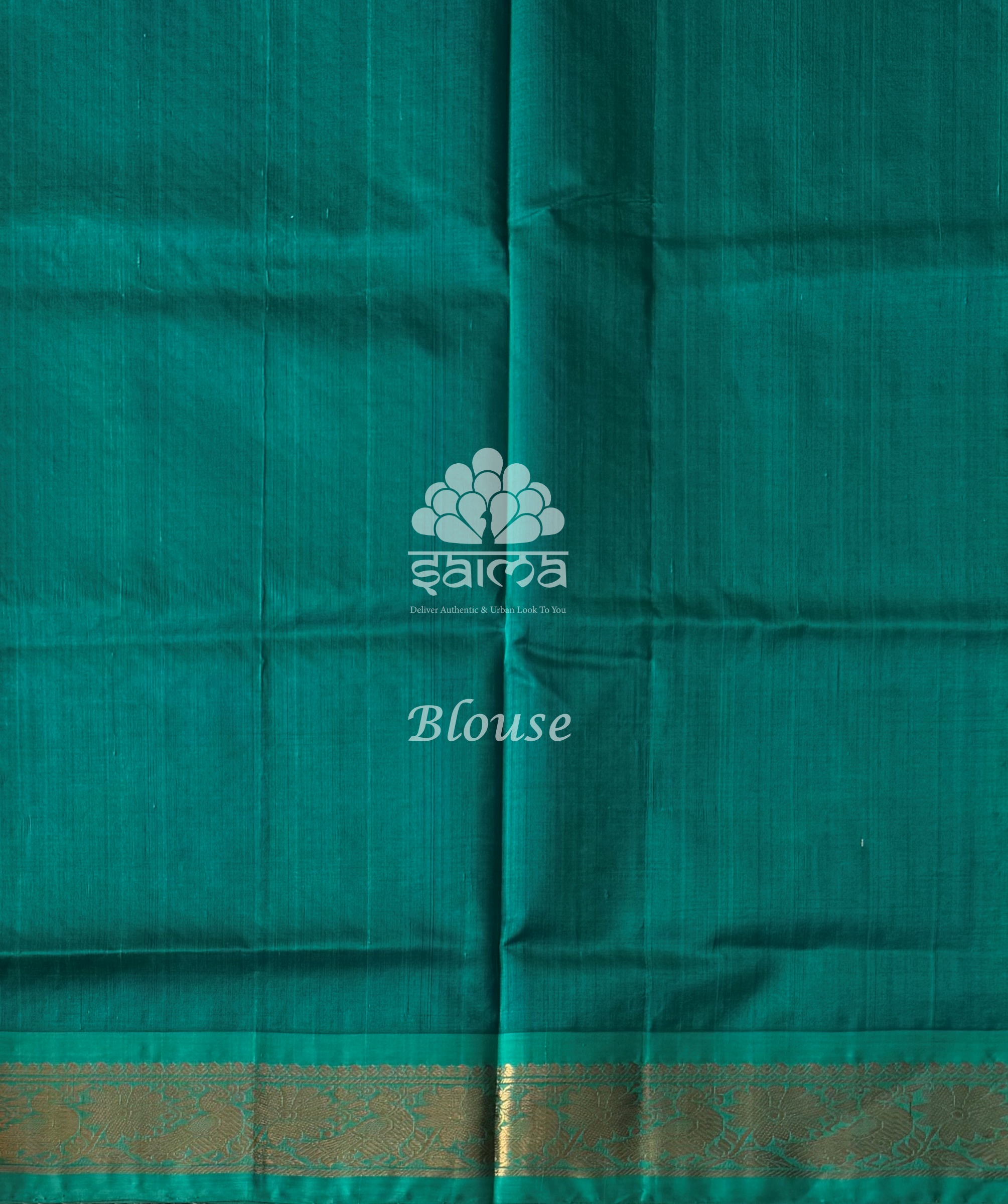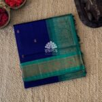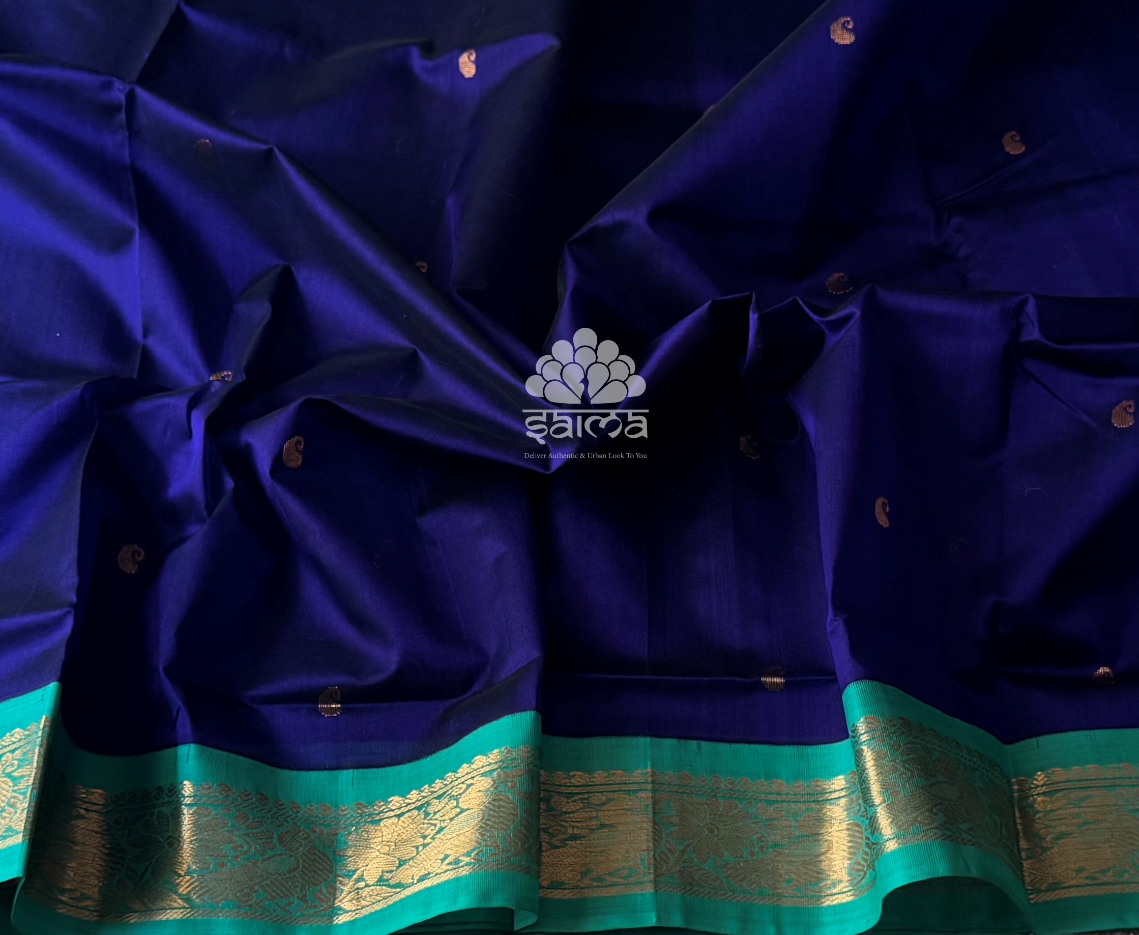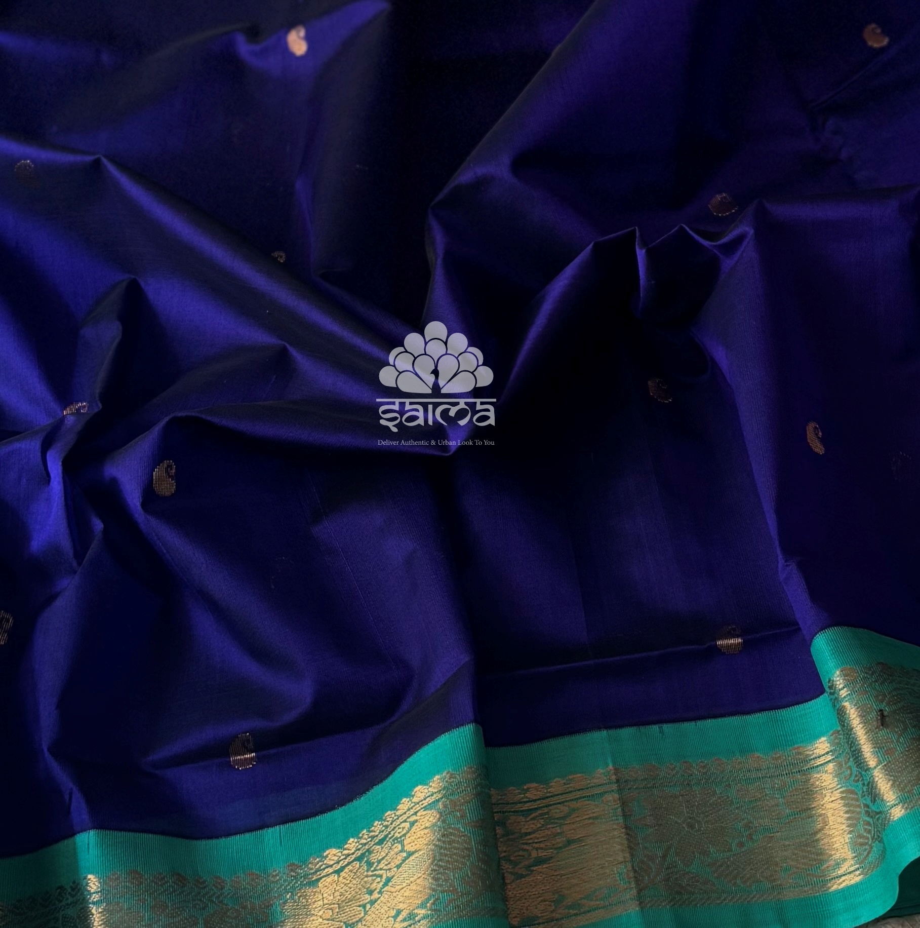 Kanchi korvai silk cotton in ink blue color and having small bhuttas design all over the saree and annapakshi design korvai border. Pallu and blouse in turquoise color.