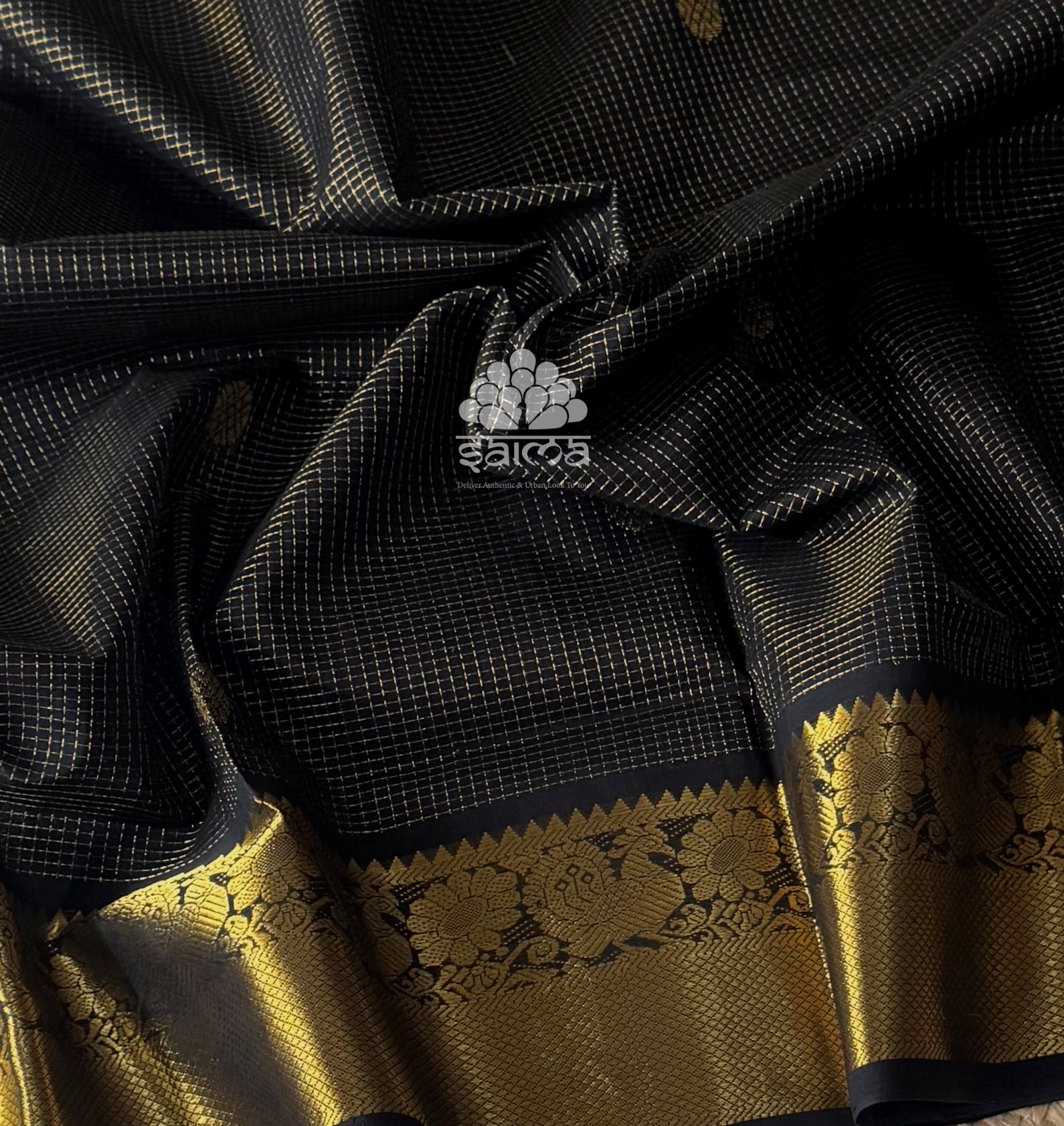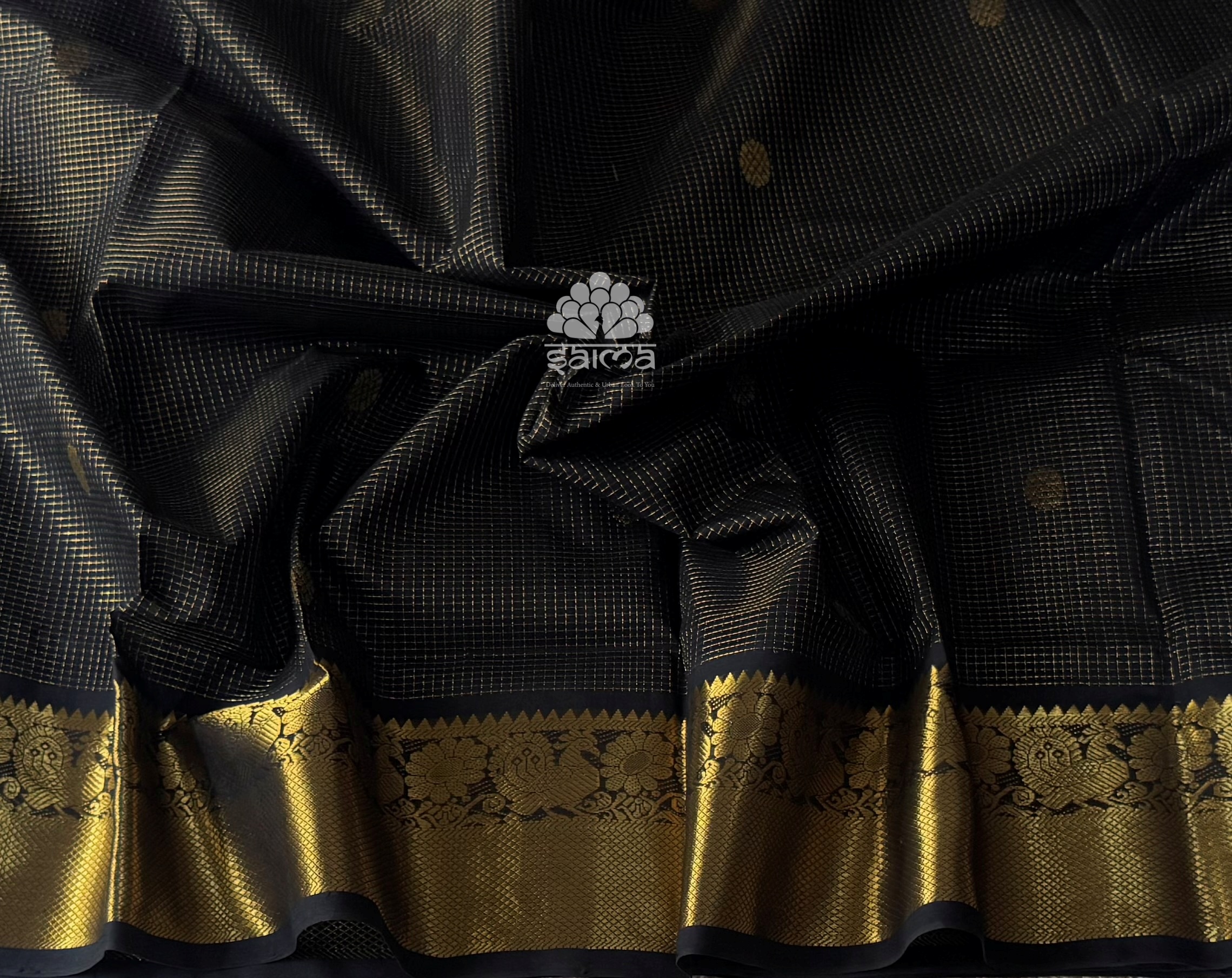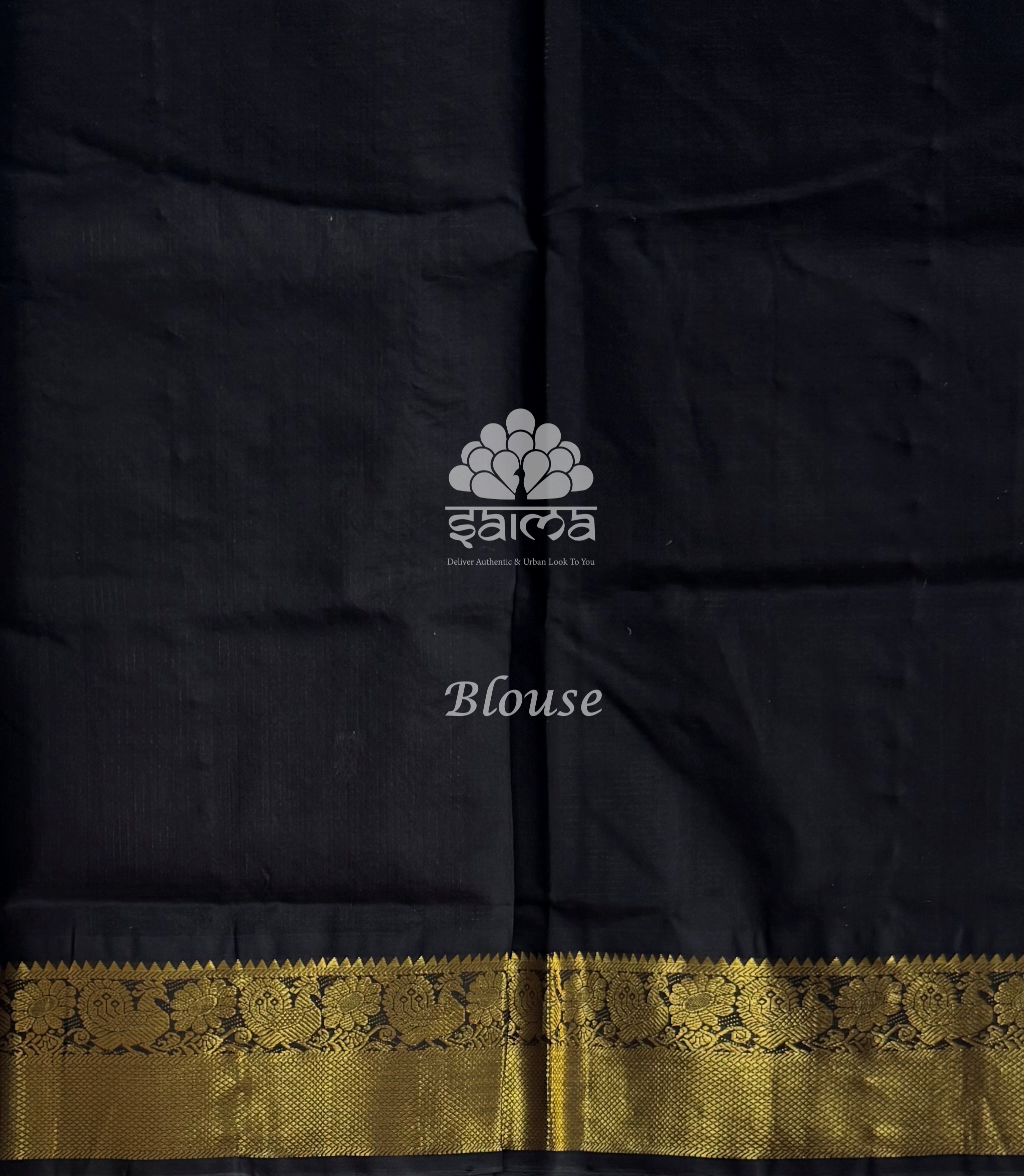 Kanchi silk cotton in black shaded color with muthu zari kattam and bhuttas all over the saree and rich zari design border .Pallu and blouse in running self color.