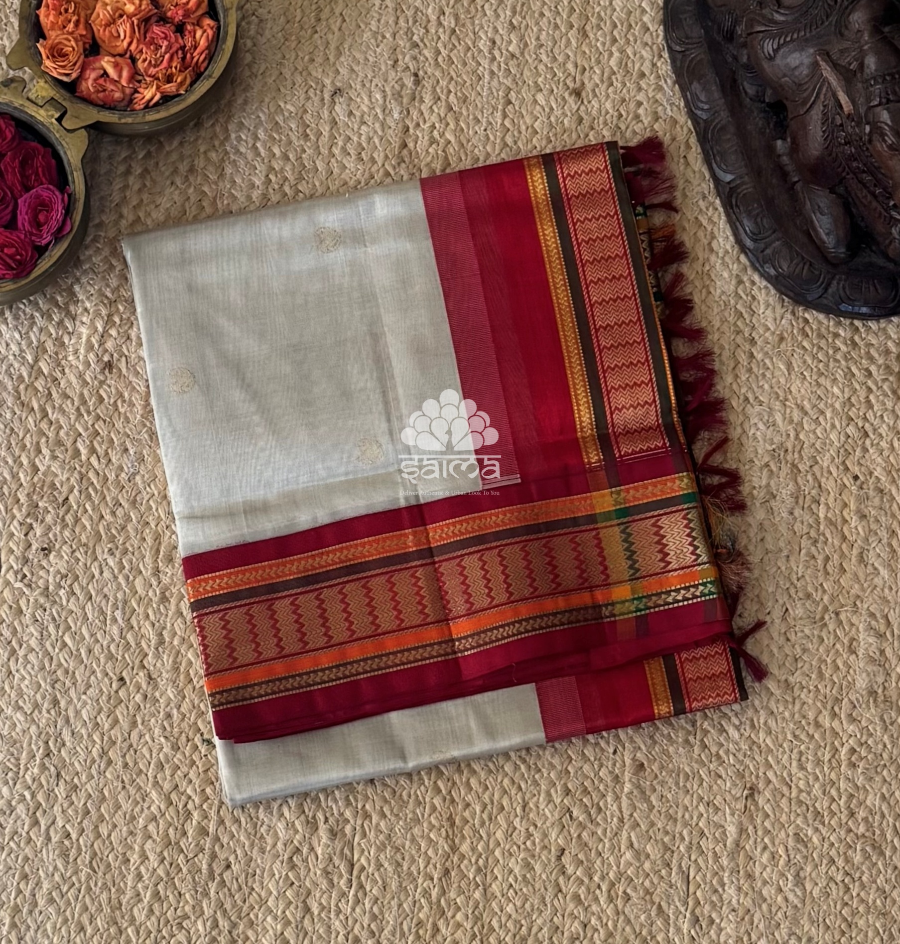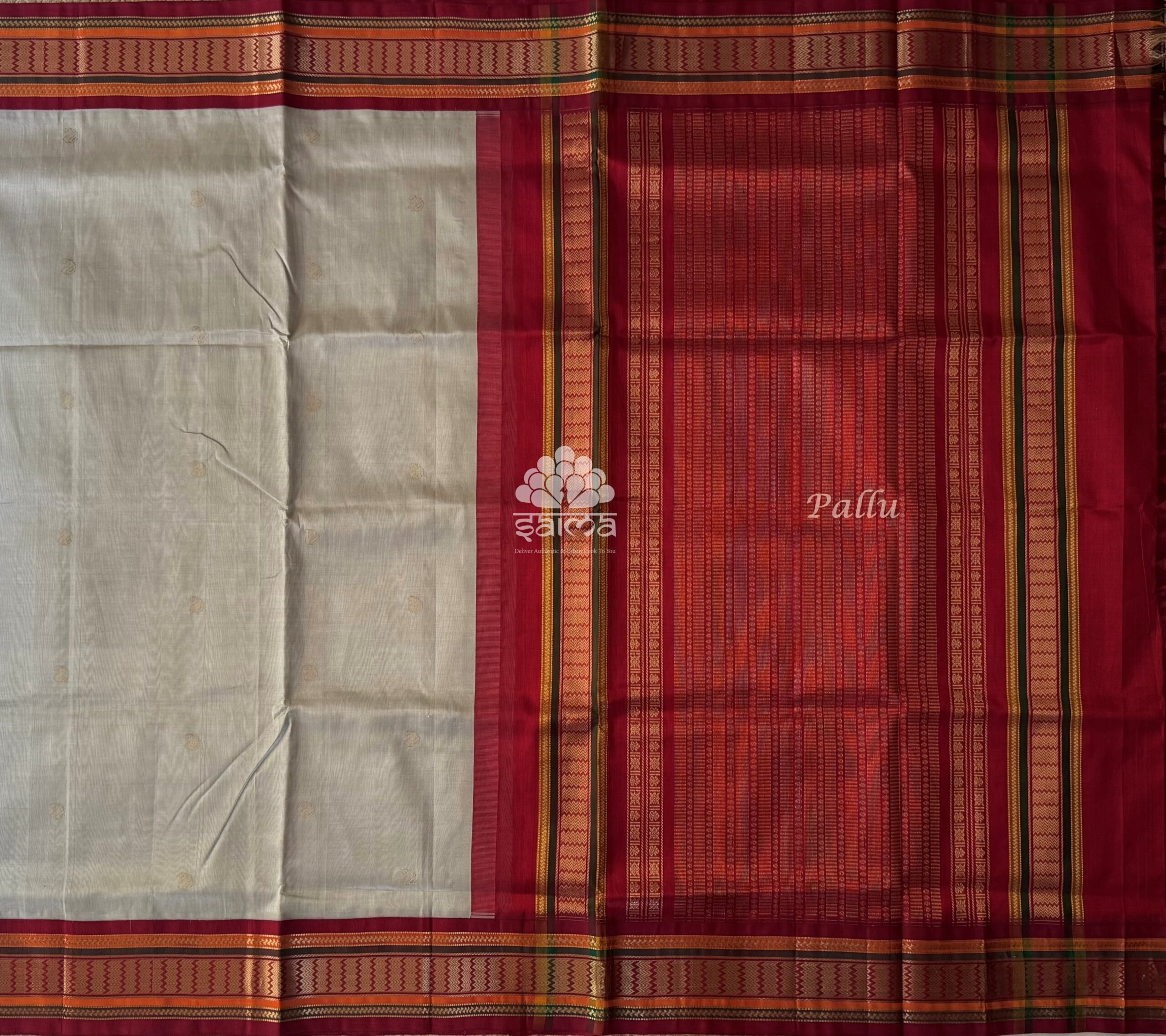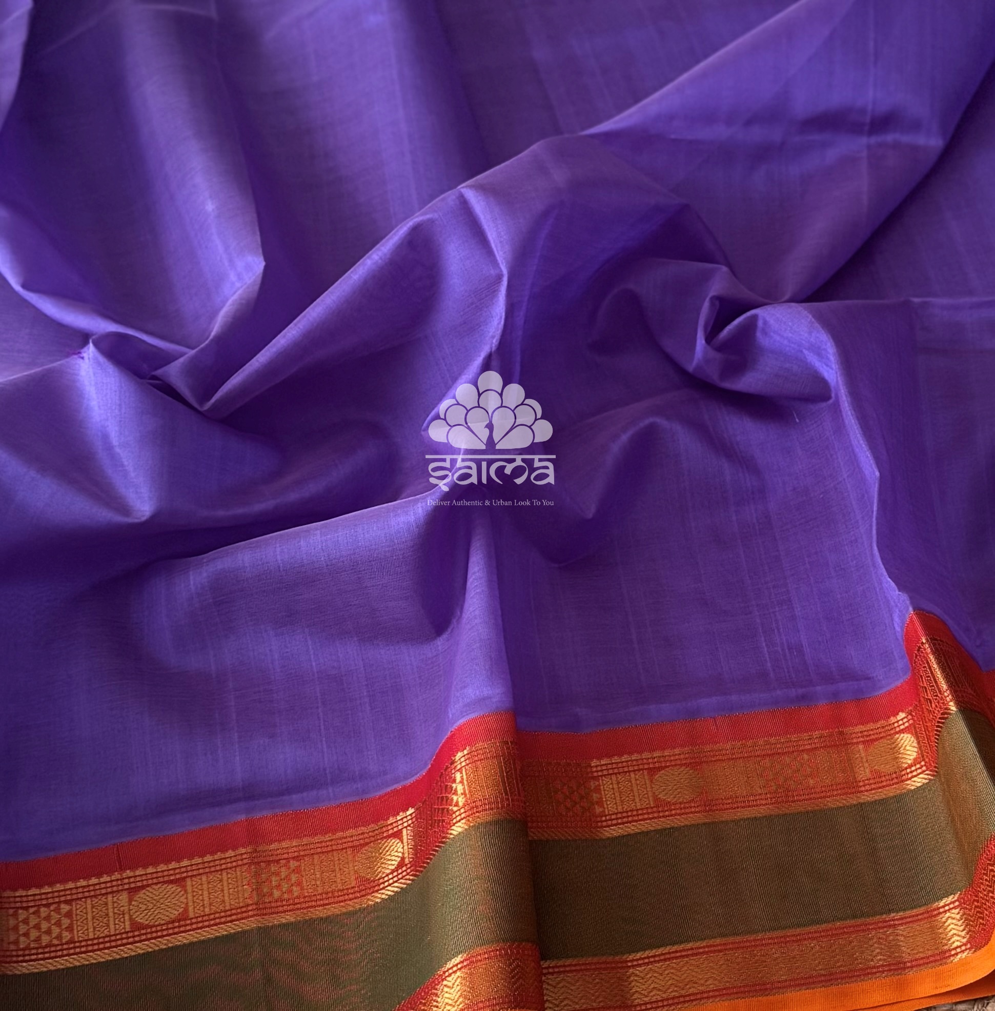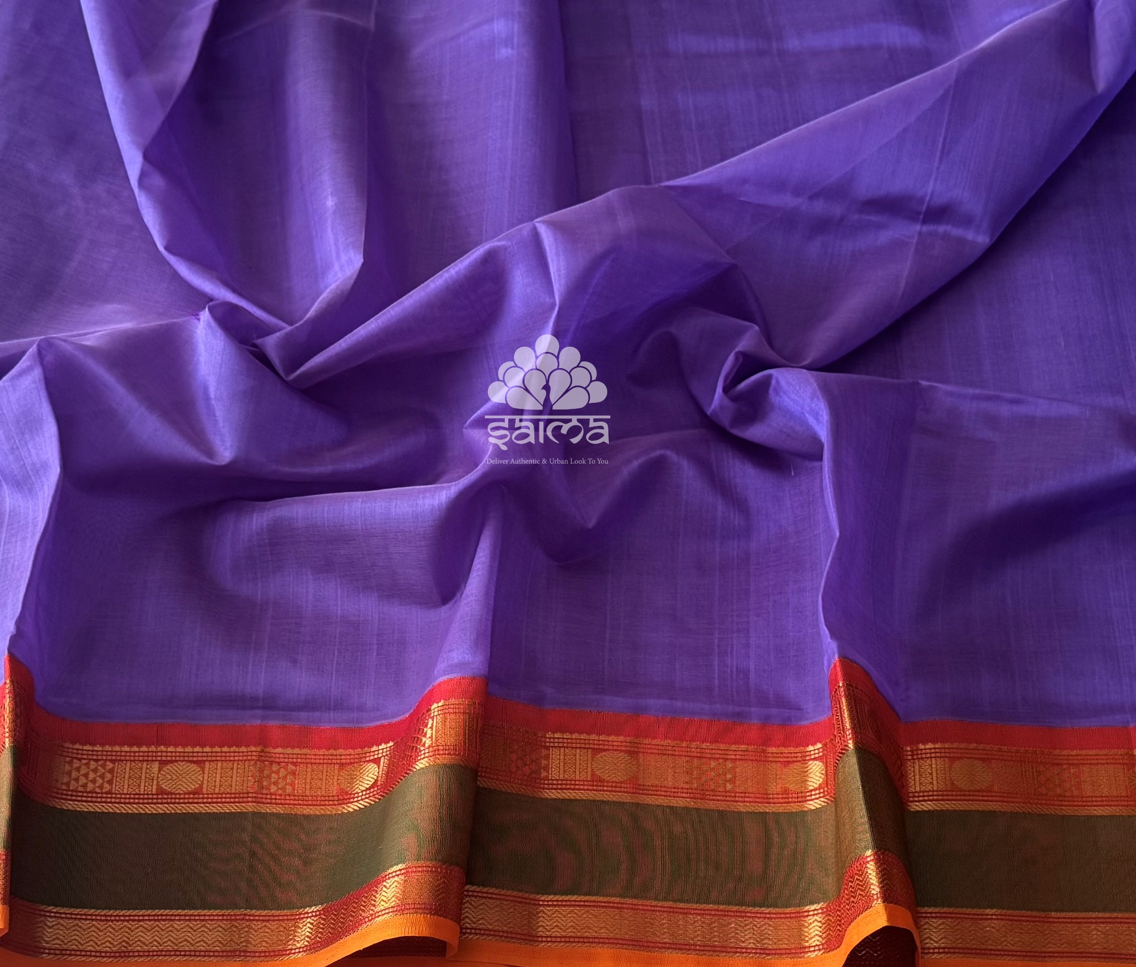 Kanchi silk cotton in periwinkle purple color and having a plain design body and rich zari design border. Pallu and blouse in brick rust shaded color.