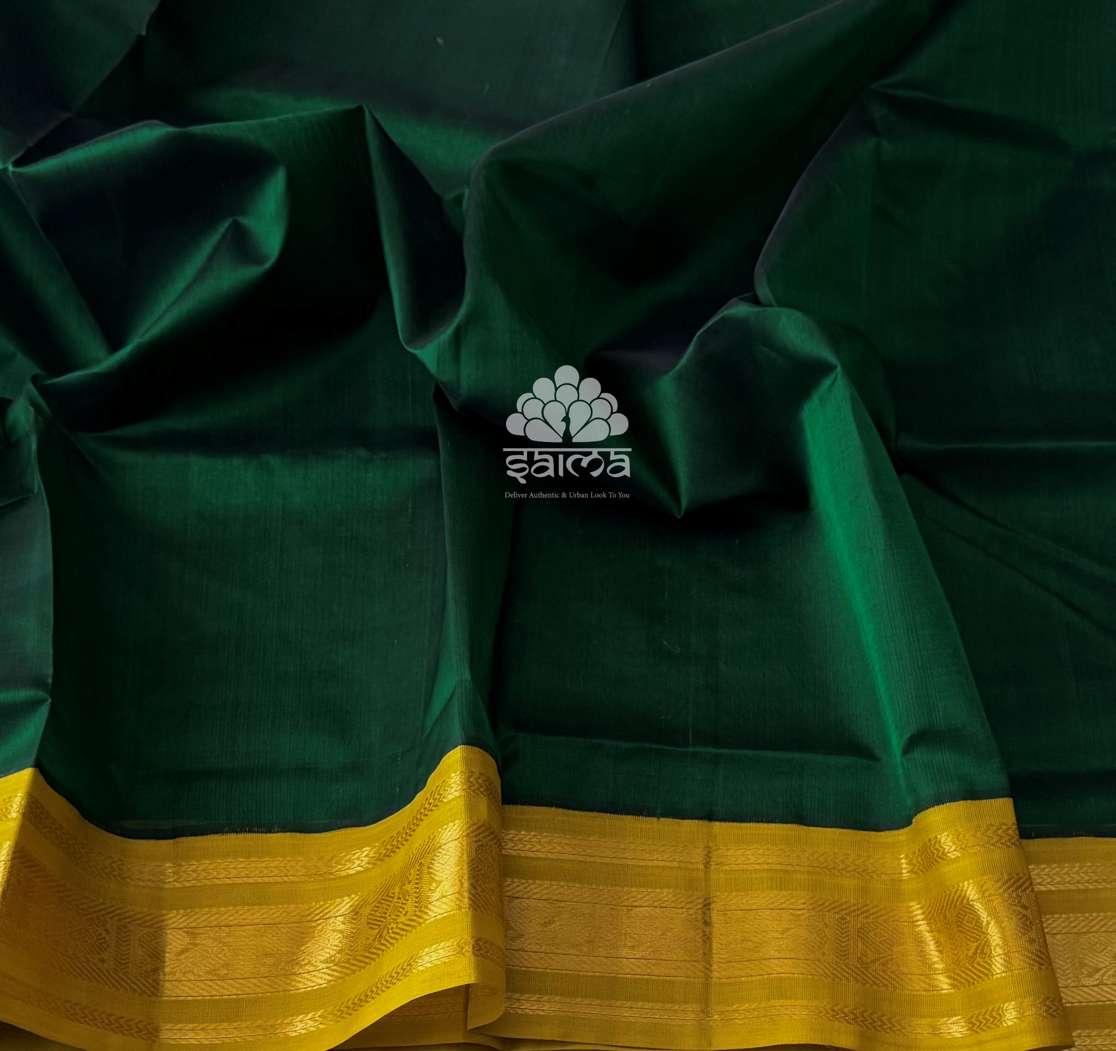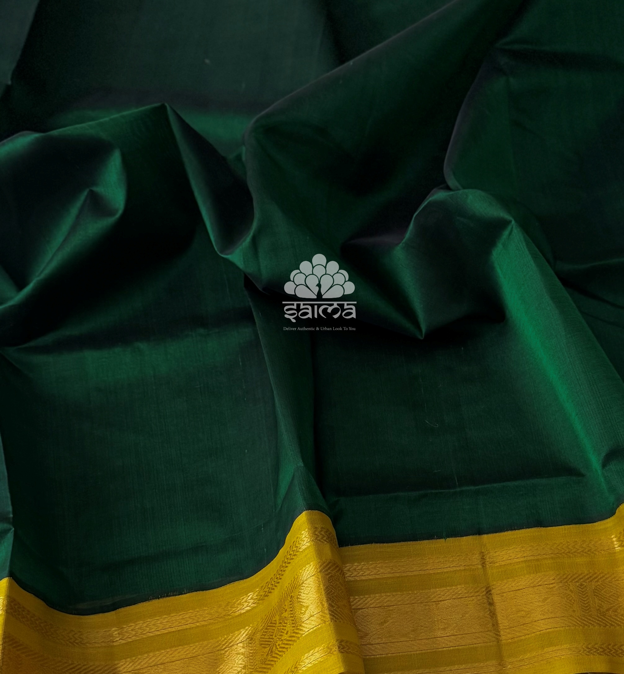 Kanchi korvai silk cotton dark green color having plain design and annapakshi designed korvai border. Pallu and blouse in mustard-gold with a subtle green undertone color.
