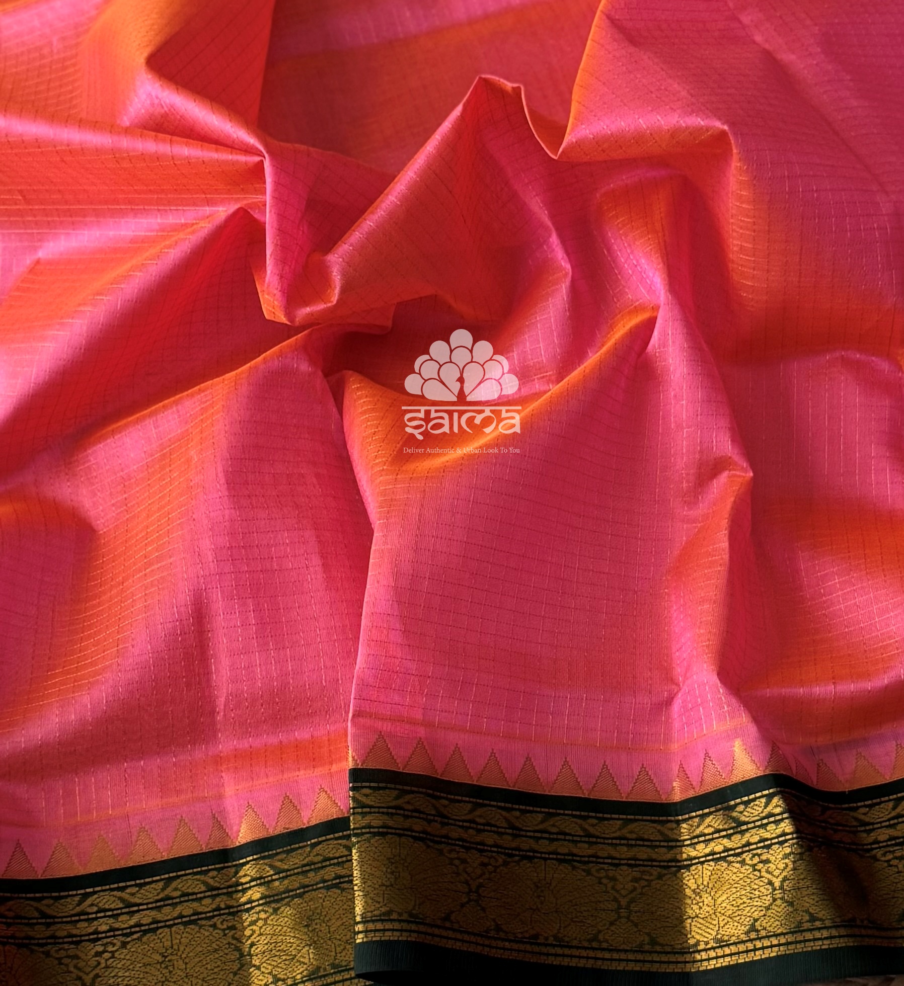 Kanchi korvai silk cotton in candy pink color having zari kattam design all over the saree and peacock designed korvai border. Pallu and blouse in dark green color.