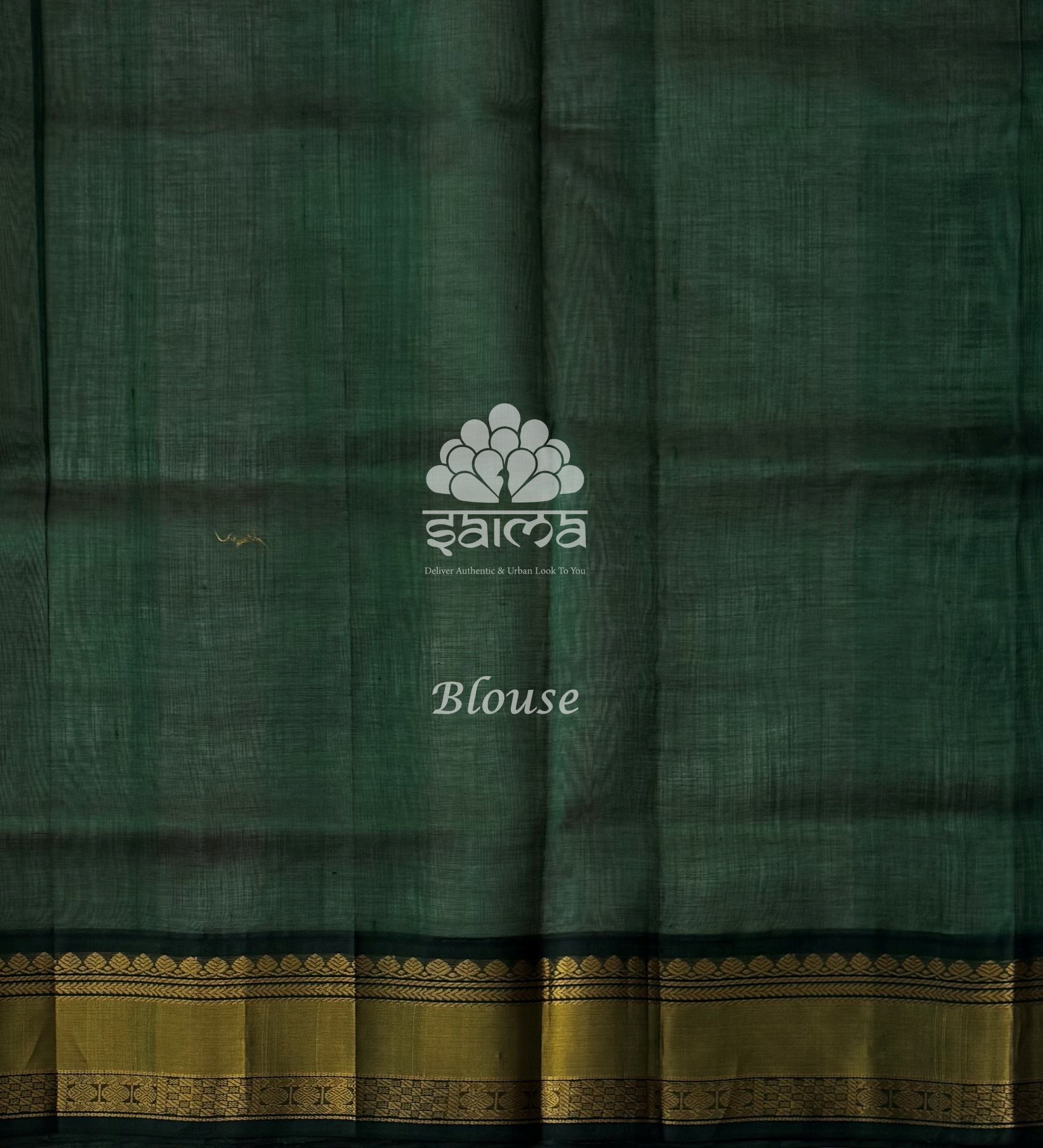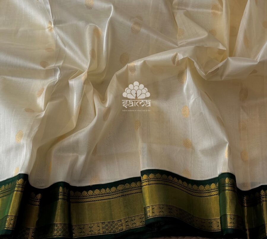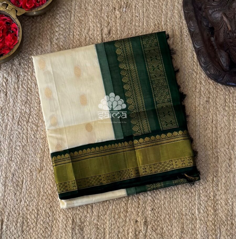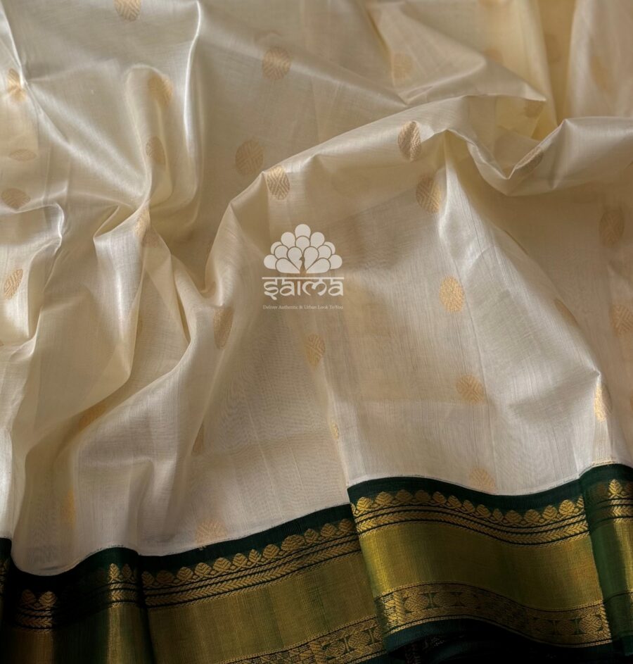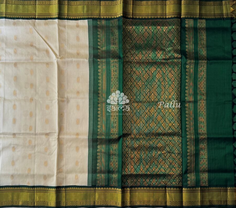 Kanchi korvai silk cotton in off white color having polka bhuttas all over the saree and pattu korvai border. Pallu and blouse in green color.
