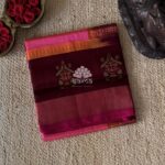Kanchi korvai silk cotton in warm pink color having fine checks design all over the saree and rettai mayil designed korvai border. Pallu and blouse in plum-brown shaded color and blouse has fine zari lines.