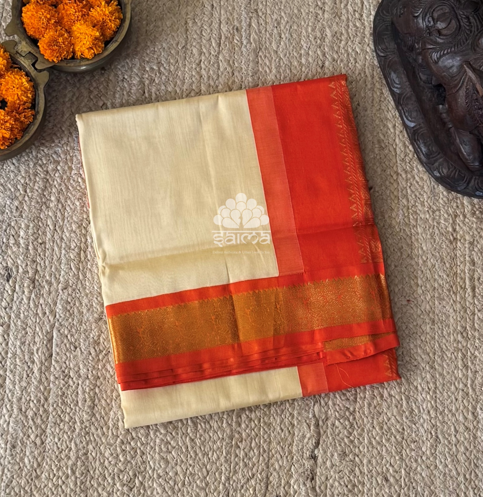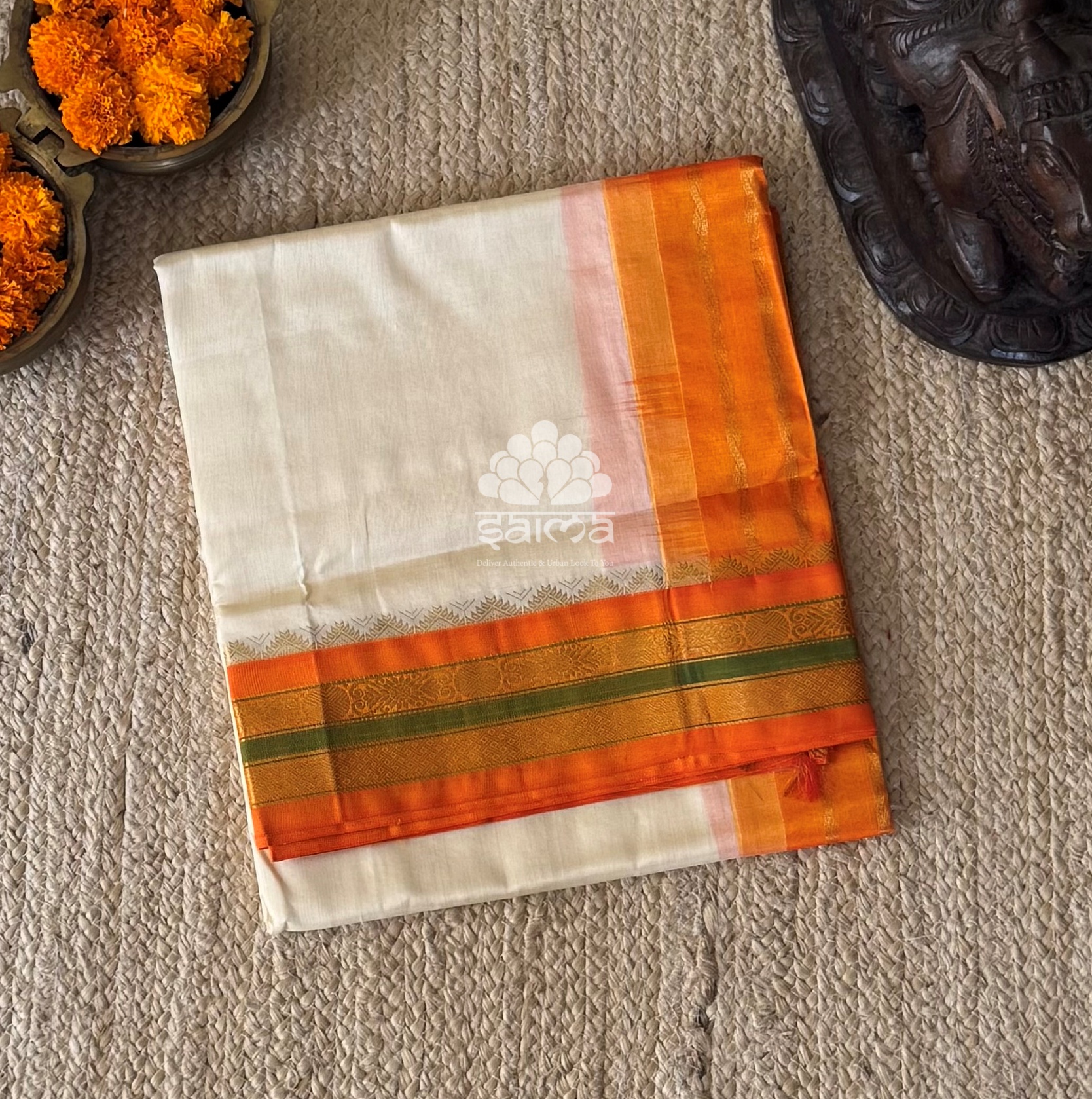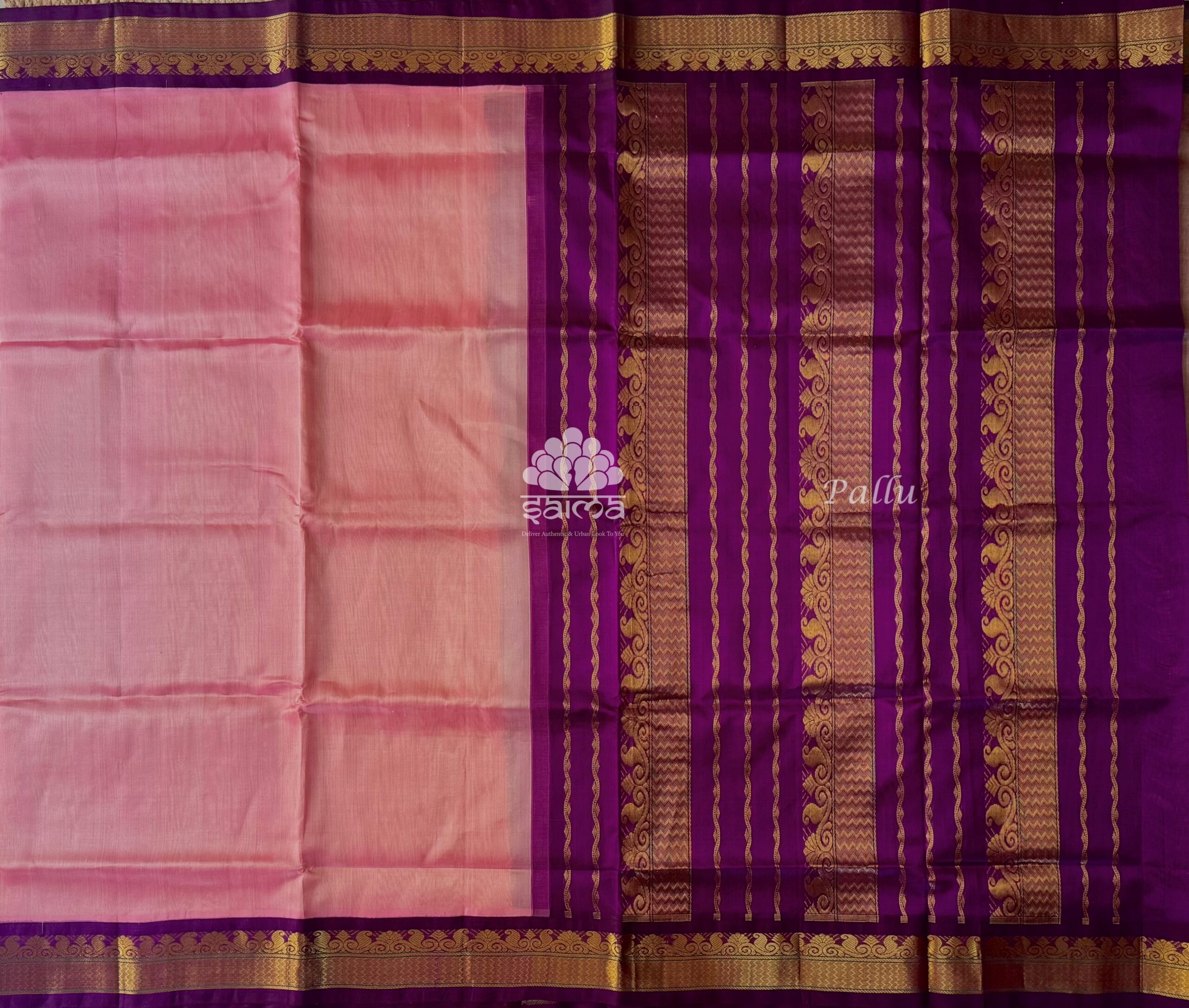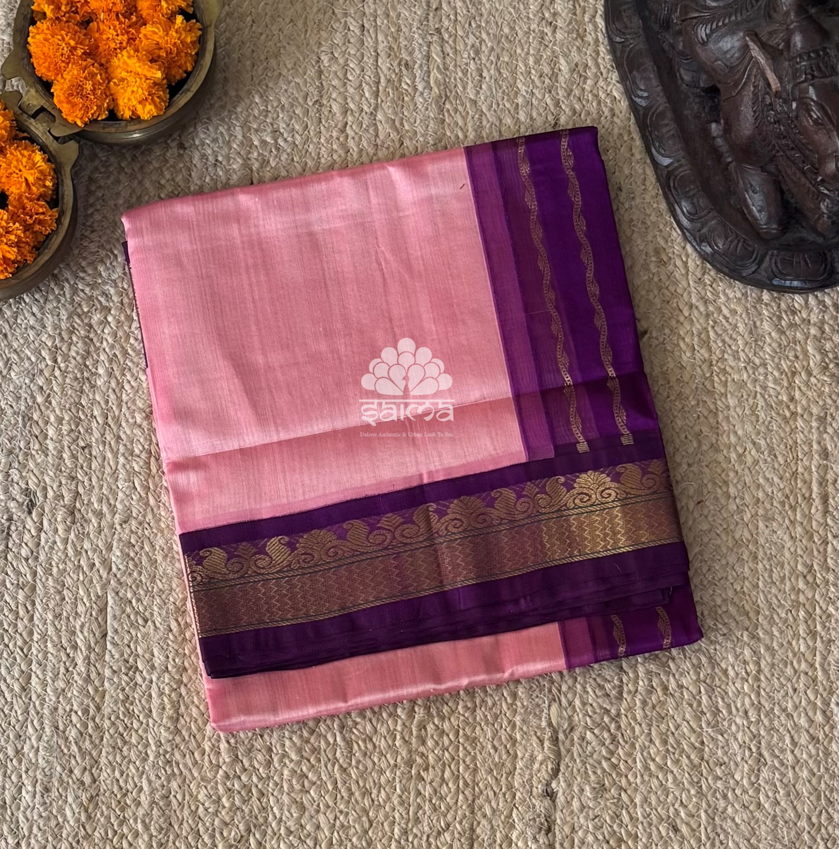 Chetti cotton in taupe grey shaded color having plain design and rettai pettu with temple design border. Saree has a running blouse yet attached silk cotton with self border design fabric as additional blouse.