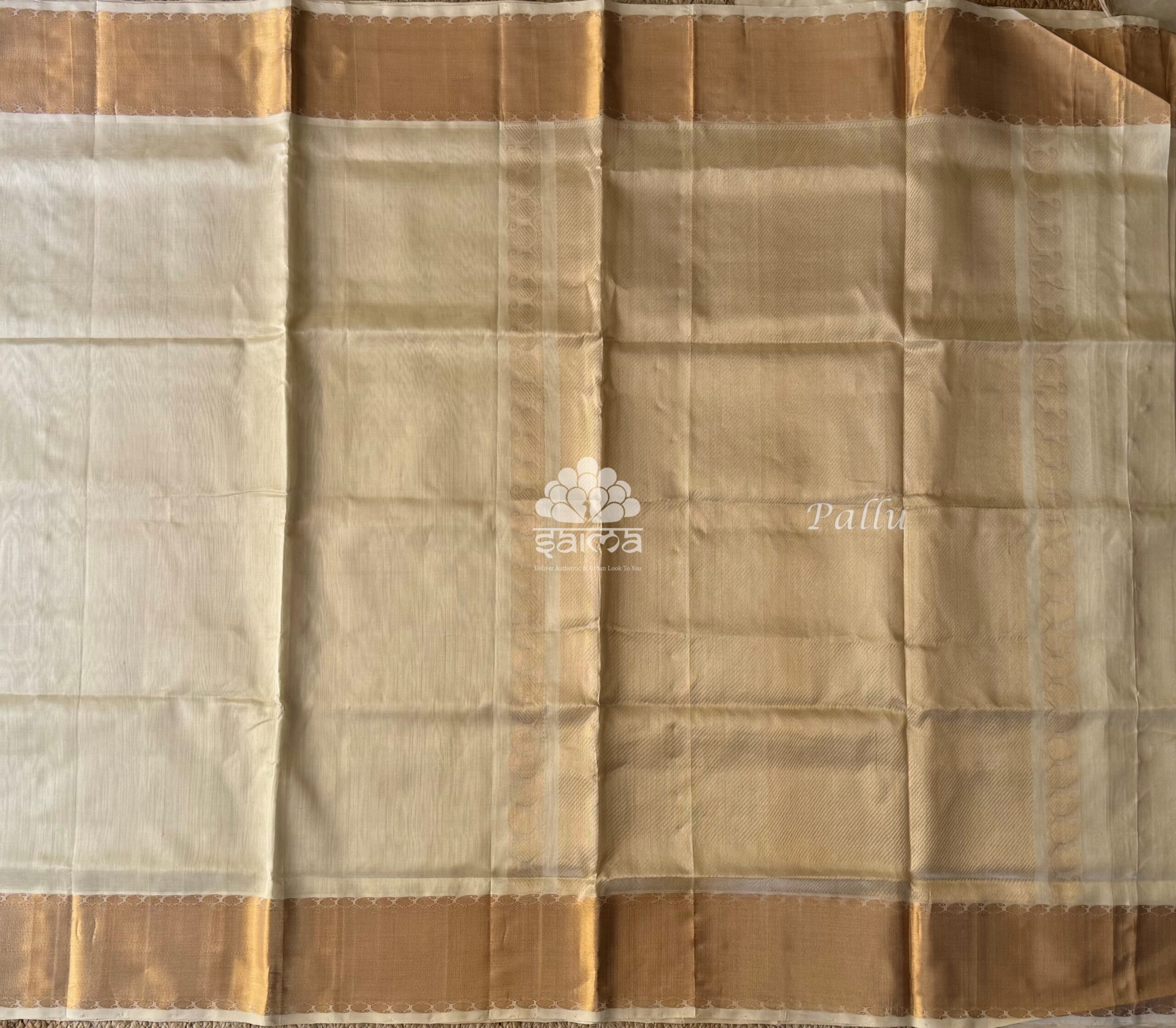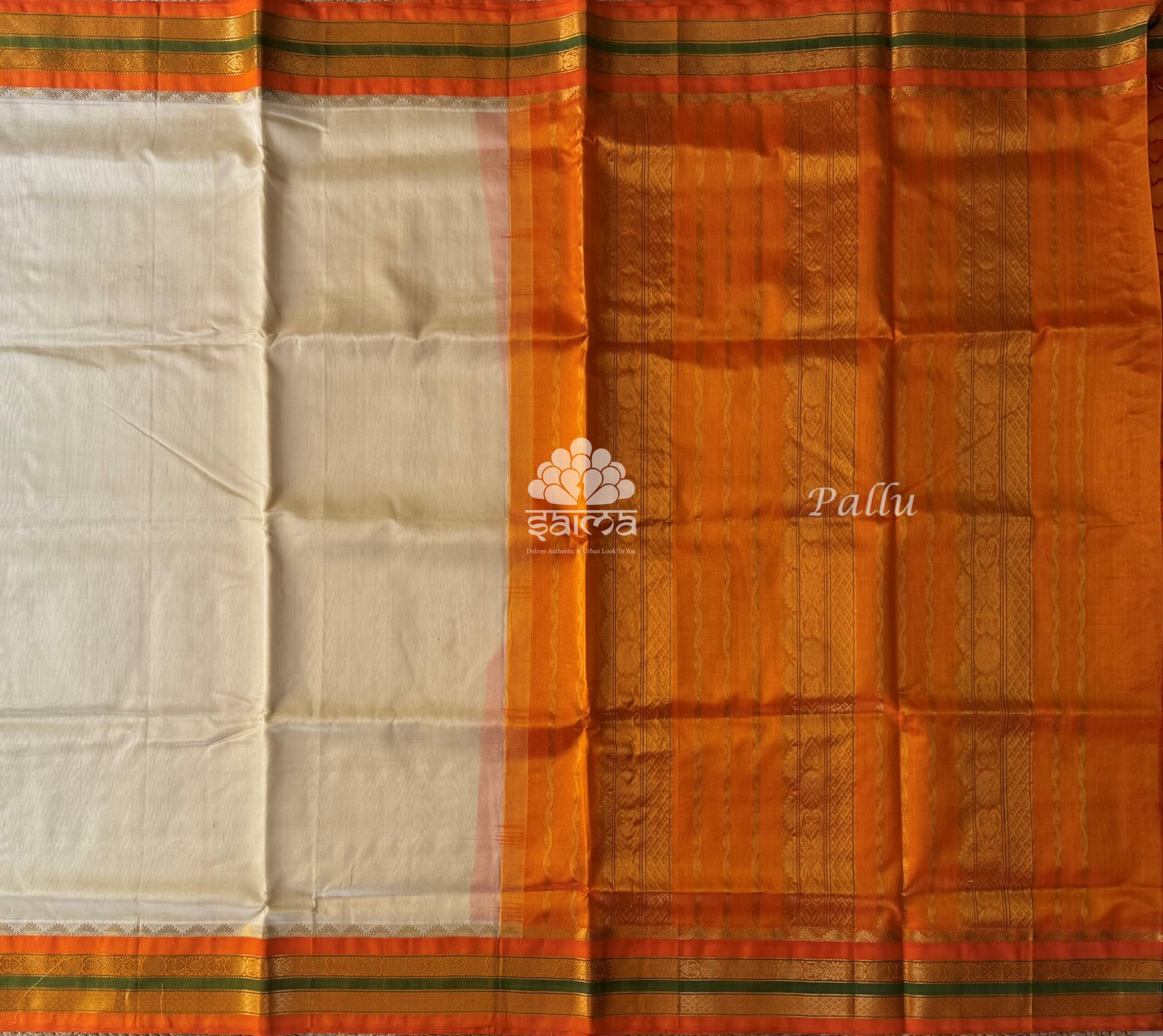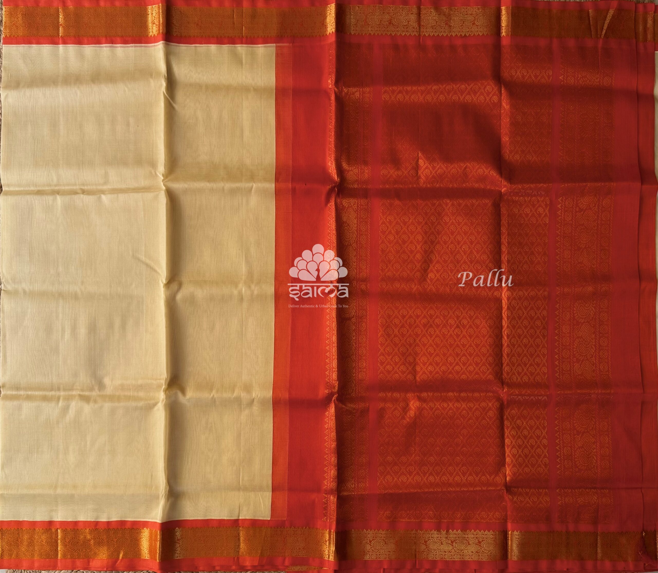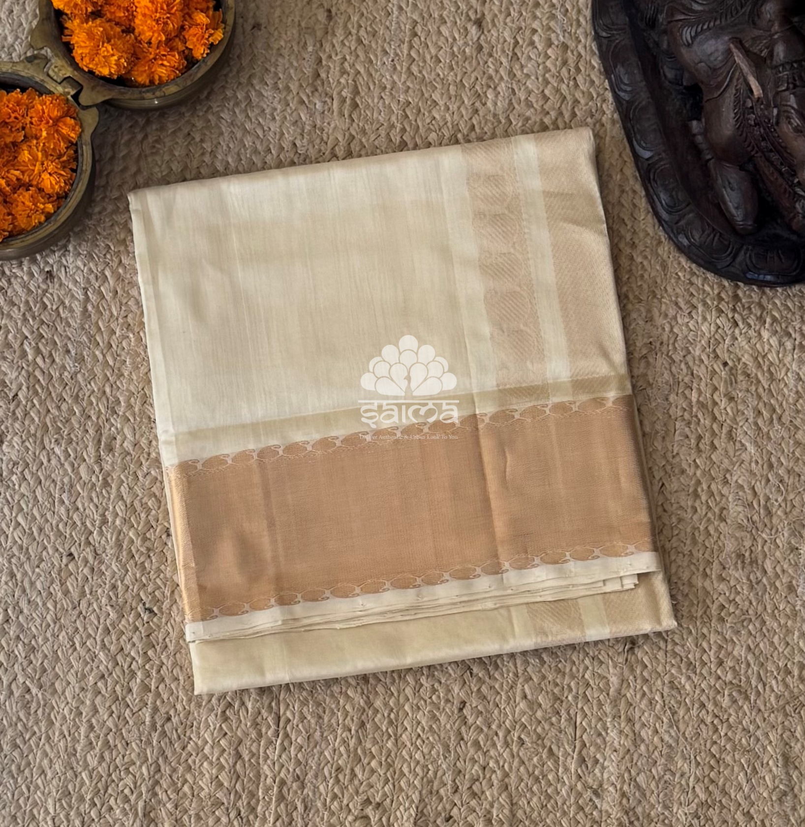 Chetti cotton in taupe grey shaded color having plain design and rettai pettu with temple design border. Saree has a running blouse yet attached silk cotton with self border design fabric as additional blouse.