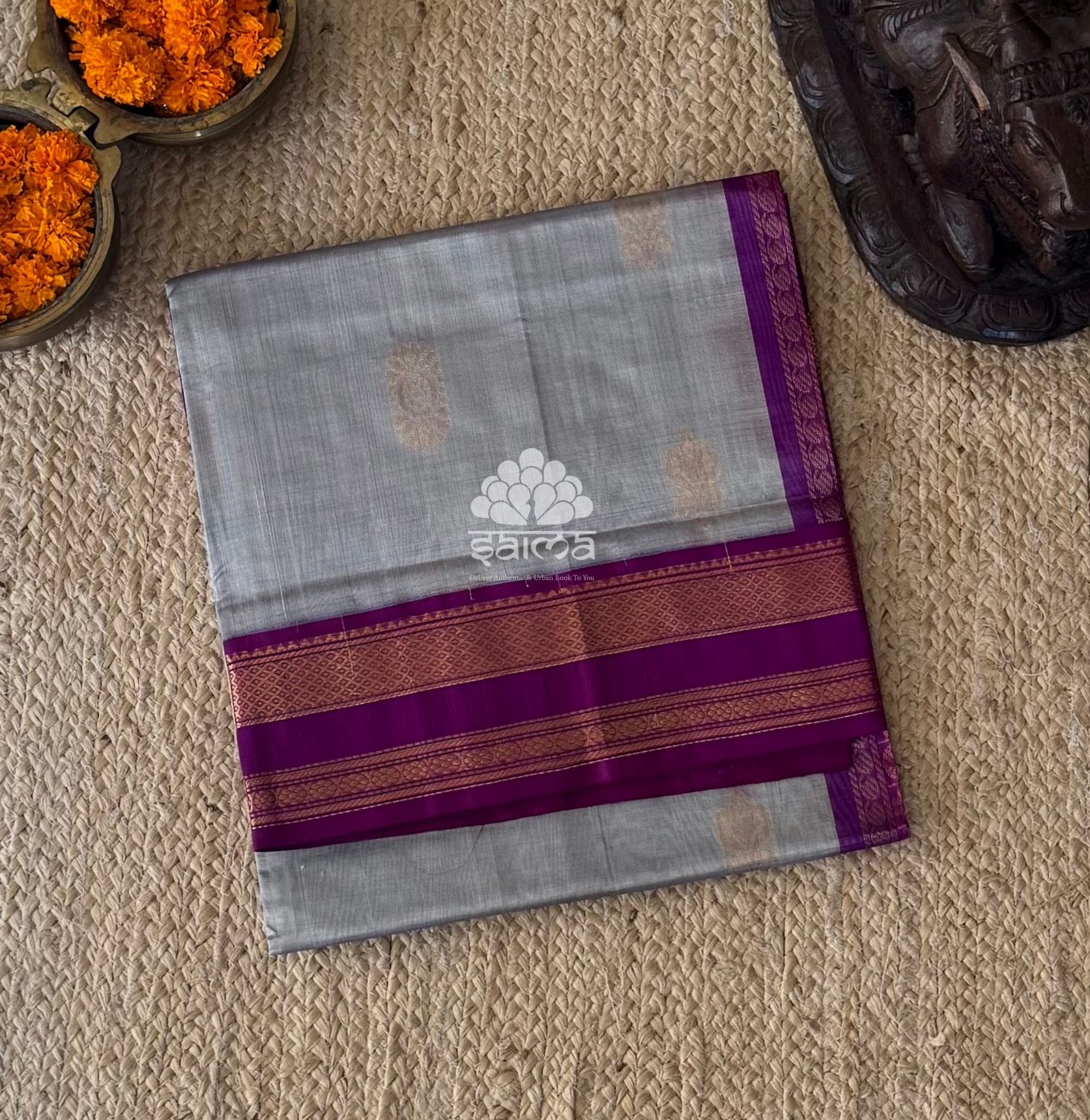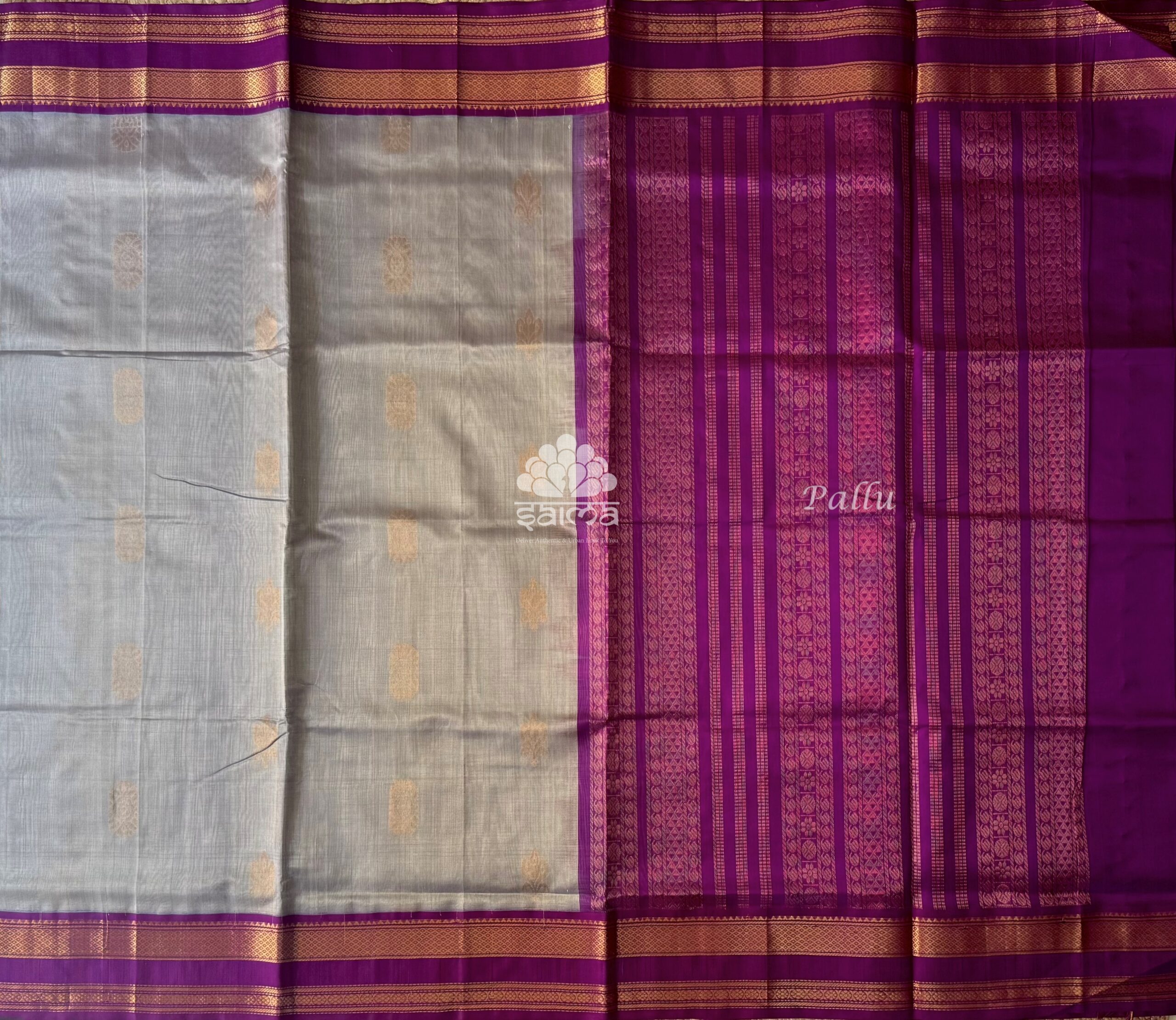 Kanchi korvai silk cotton in soft warm grey color having floral bhuttas design all over the saree and zari designed korvai border. Pallu and blouse in purple magenta color.