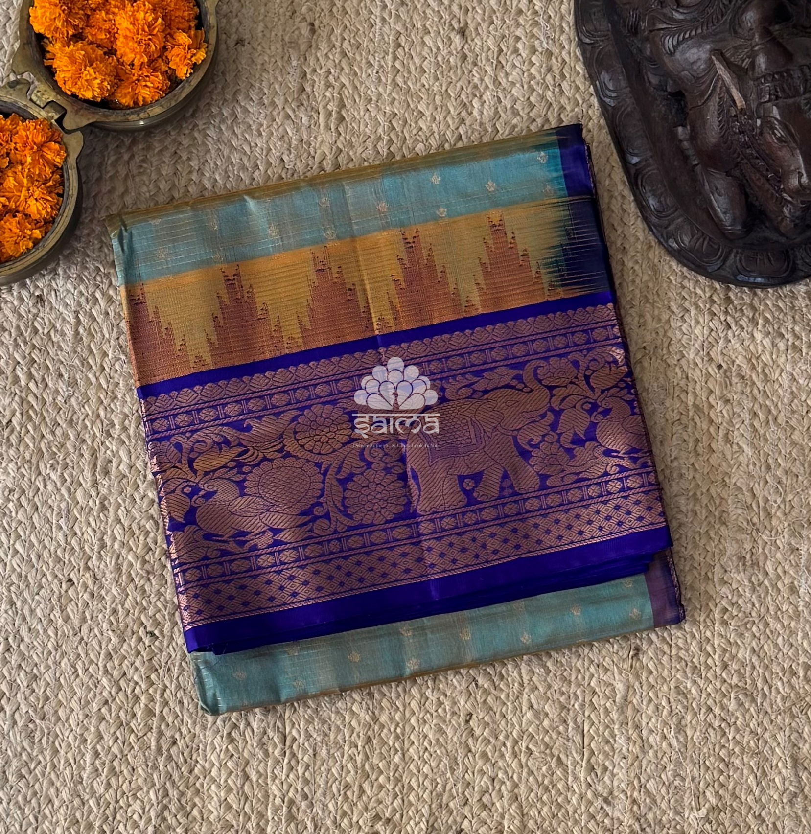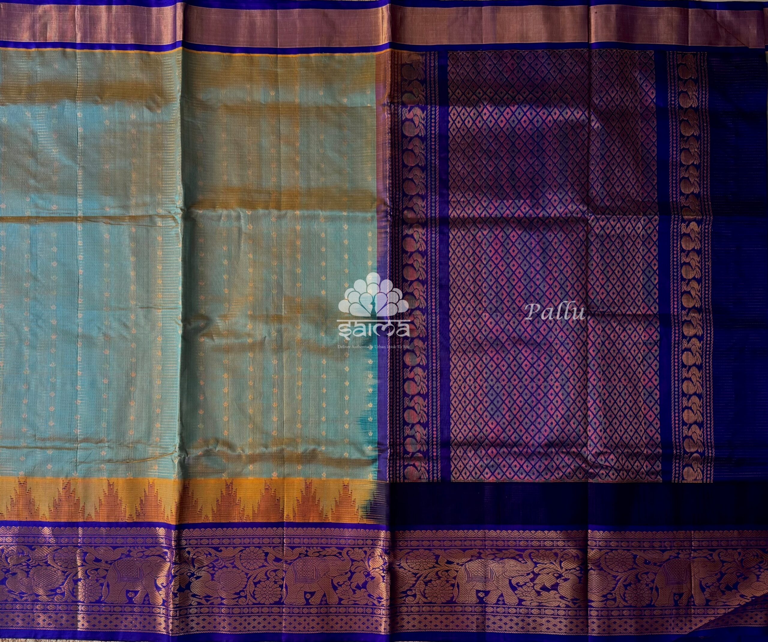 Kanchi korvai silk cotton in dual crossing aqua blue color having vairaoosie with bhuttas design all over the saree and rich forestry with thazhampoo designed korvai border. Pallu and blouse in blue color.