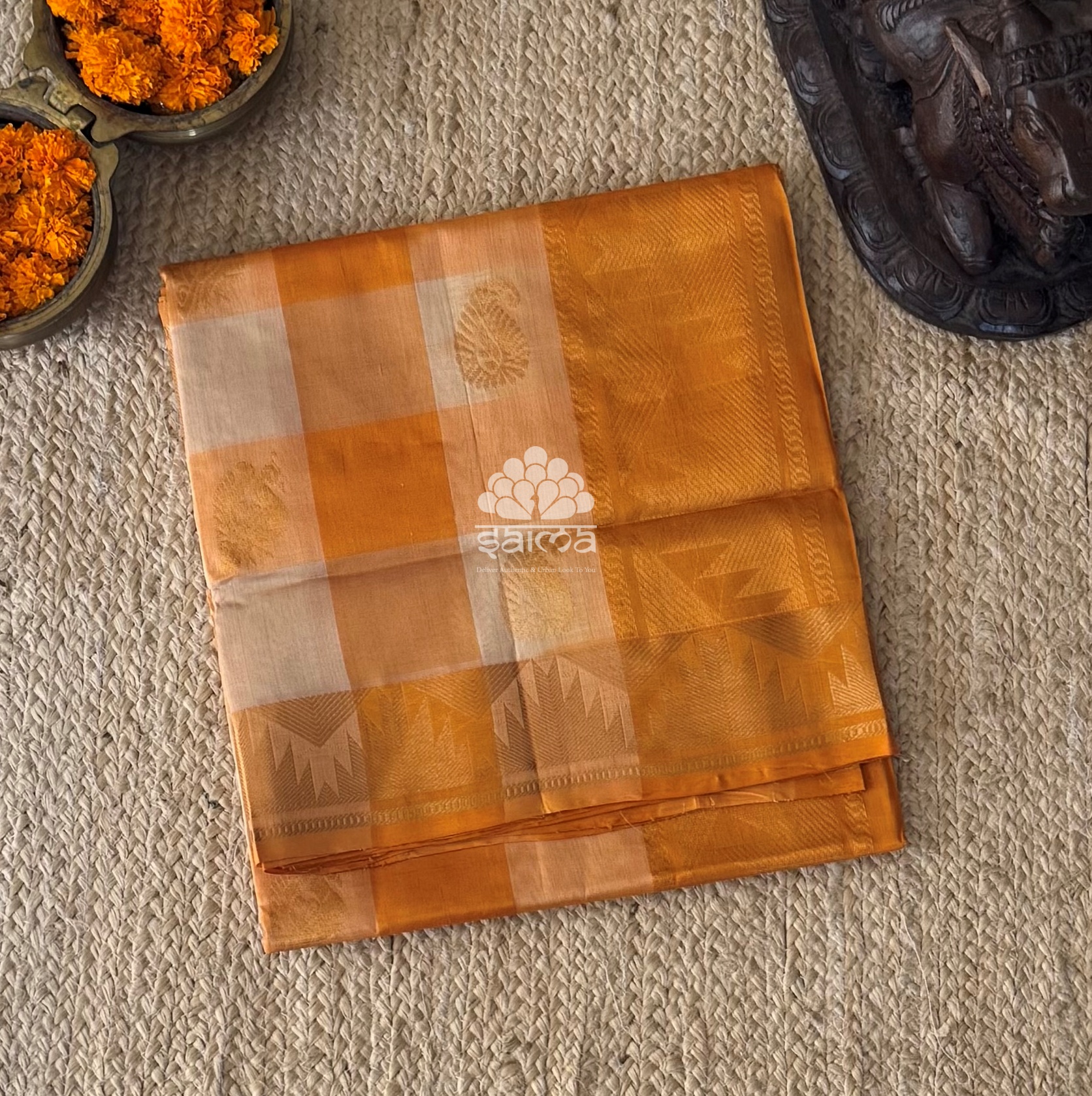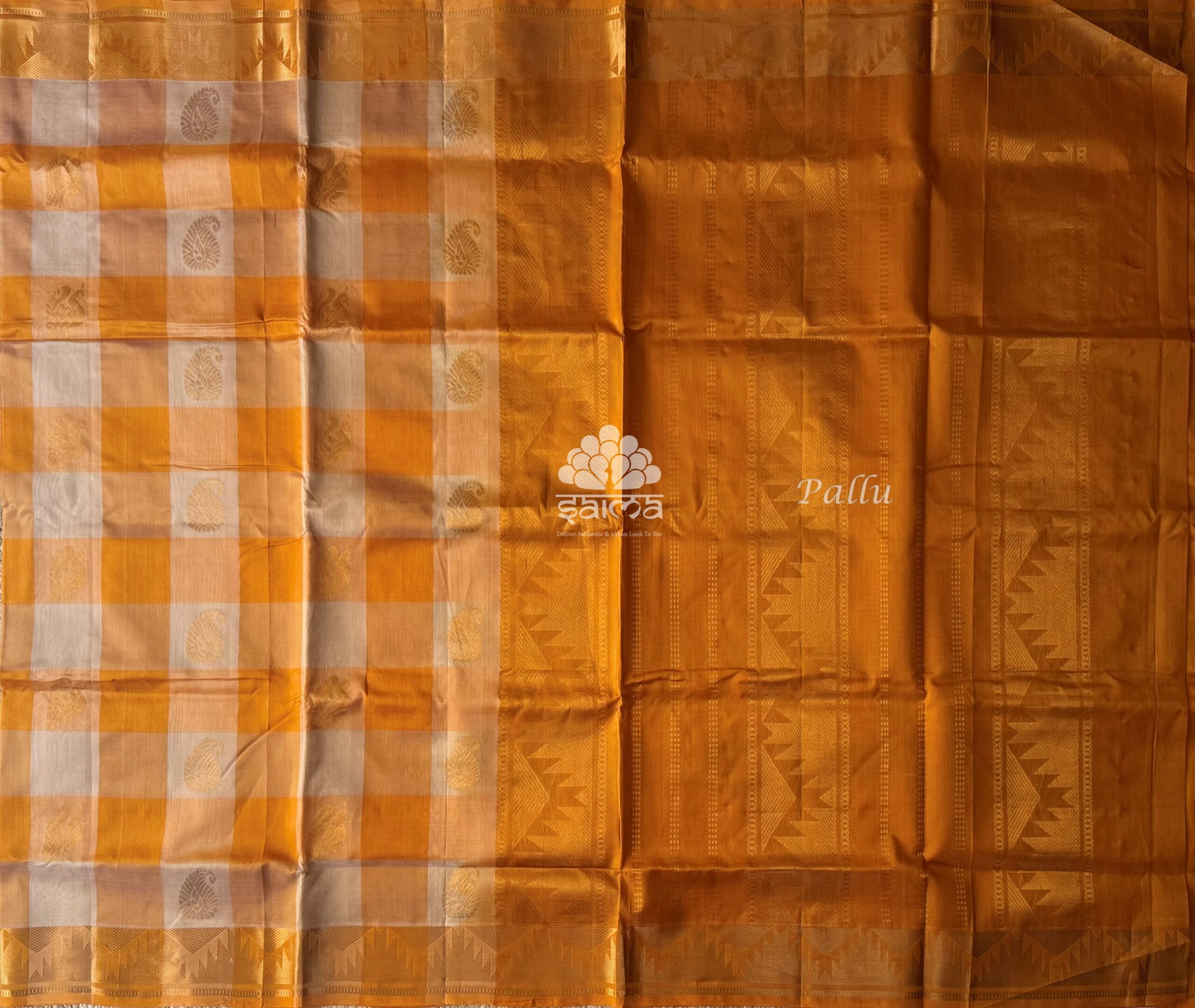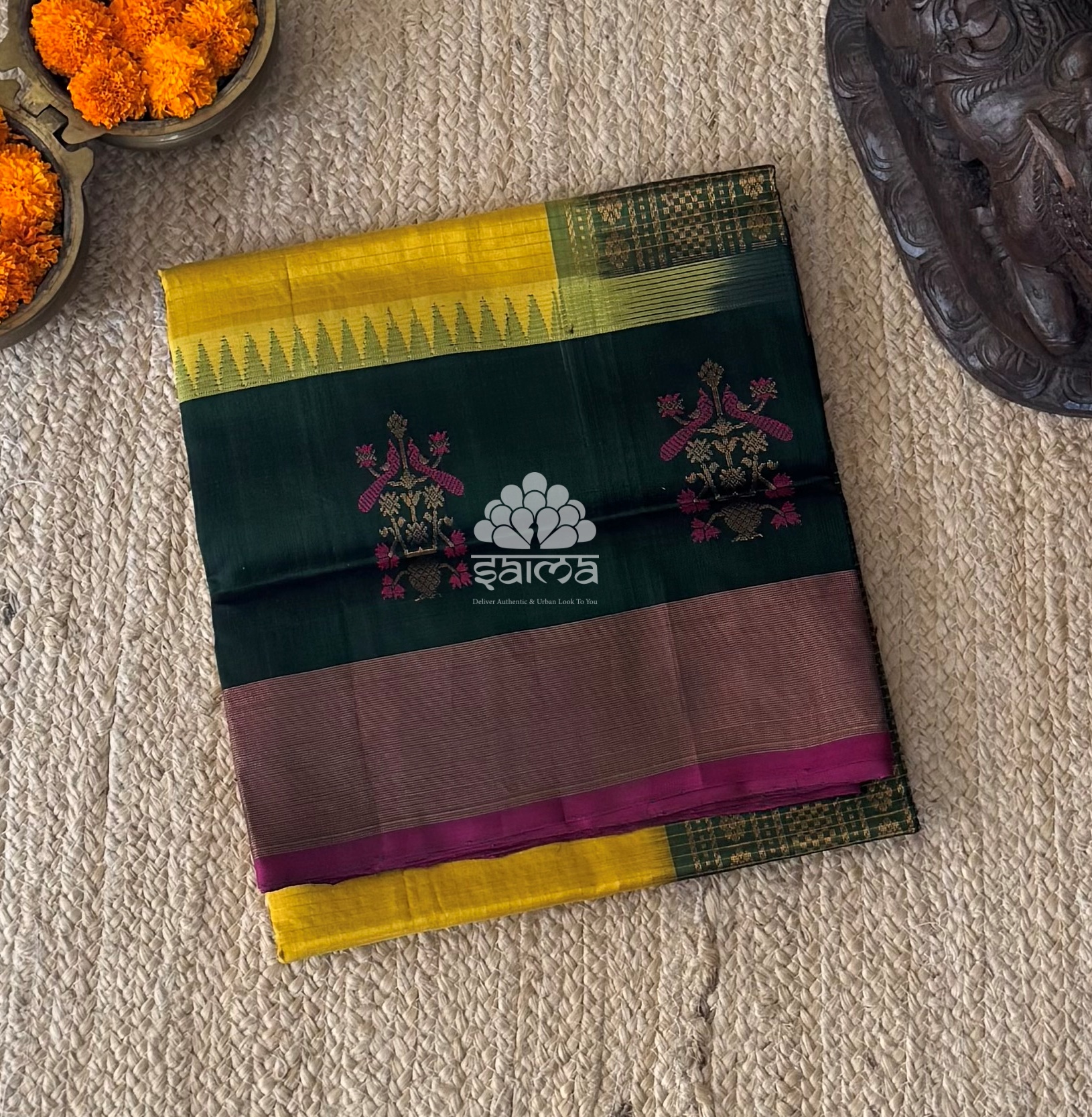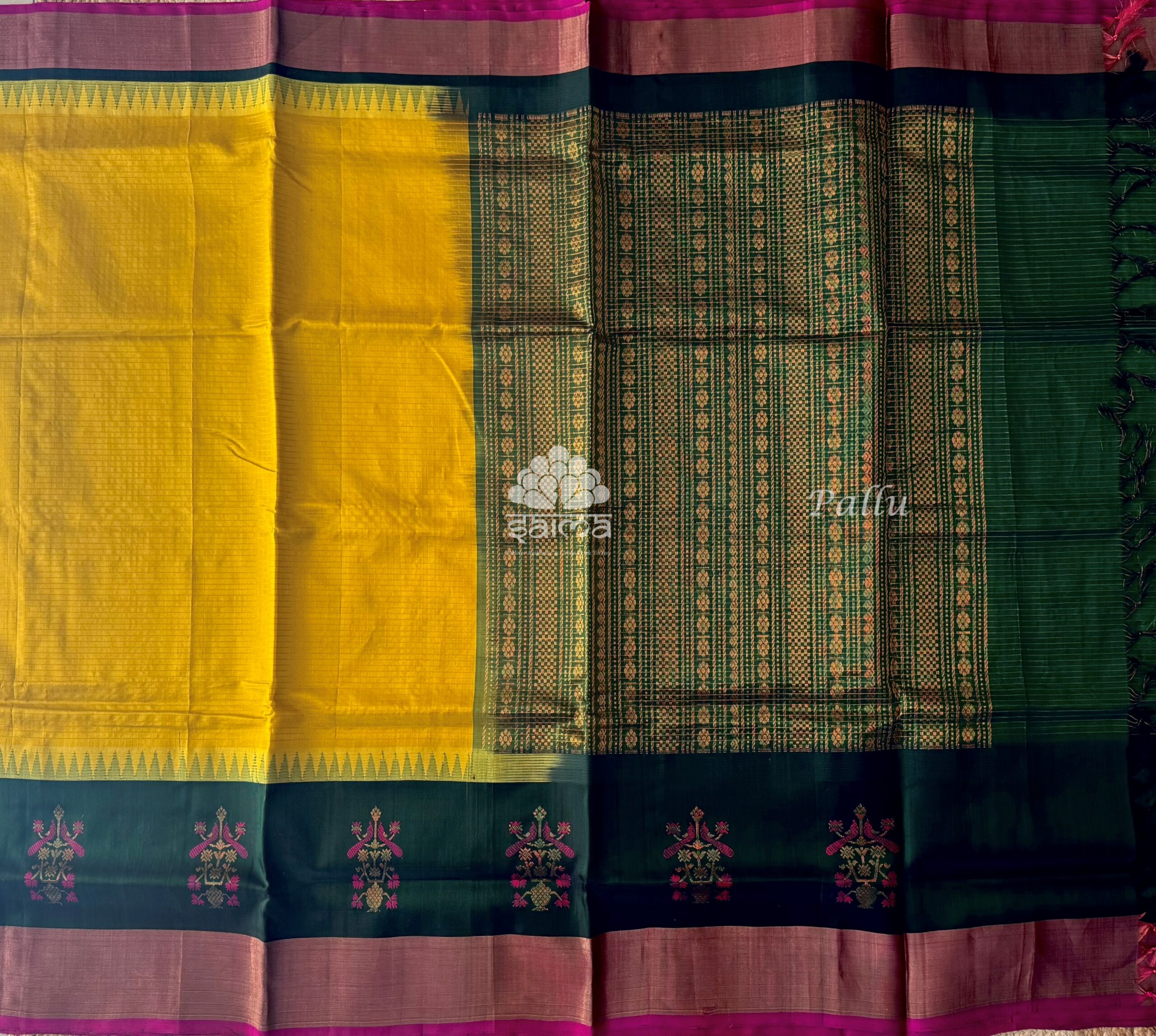 Kanchi korvai silk cotton in yellow color having fine checks design all over the saree and mayil designed korvai border. Pallu and blouse in dark green shaded color and blouse has fine zari lines.