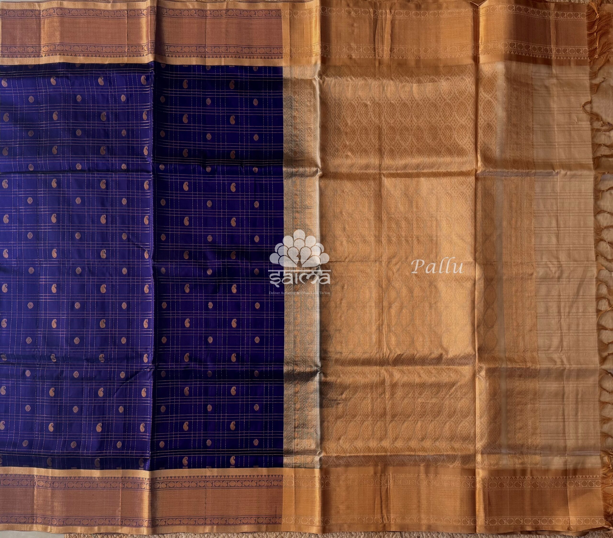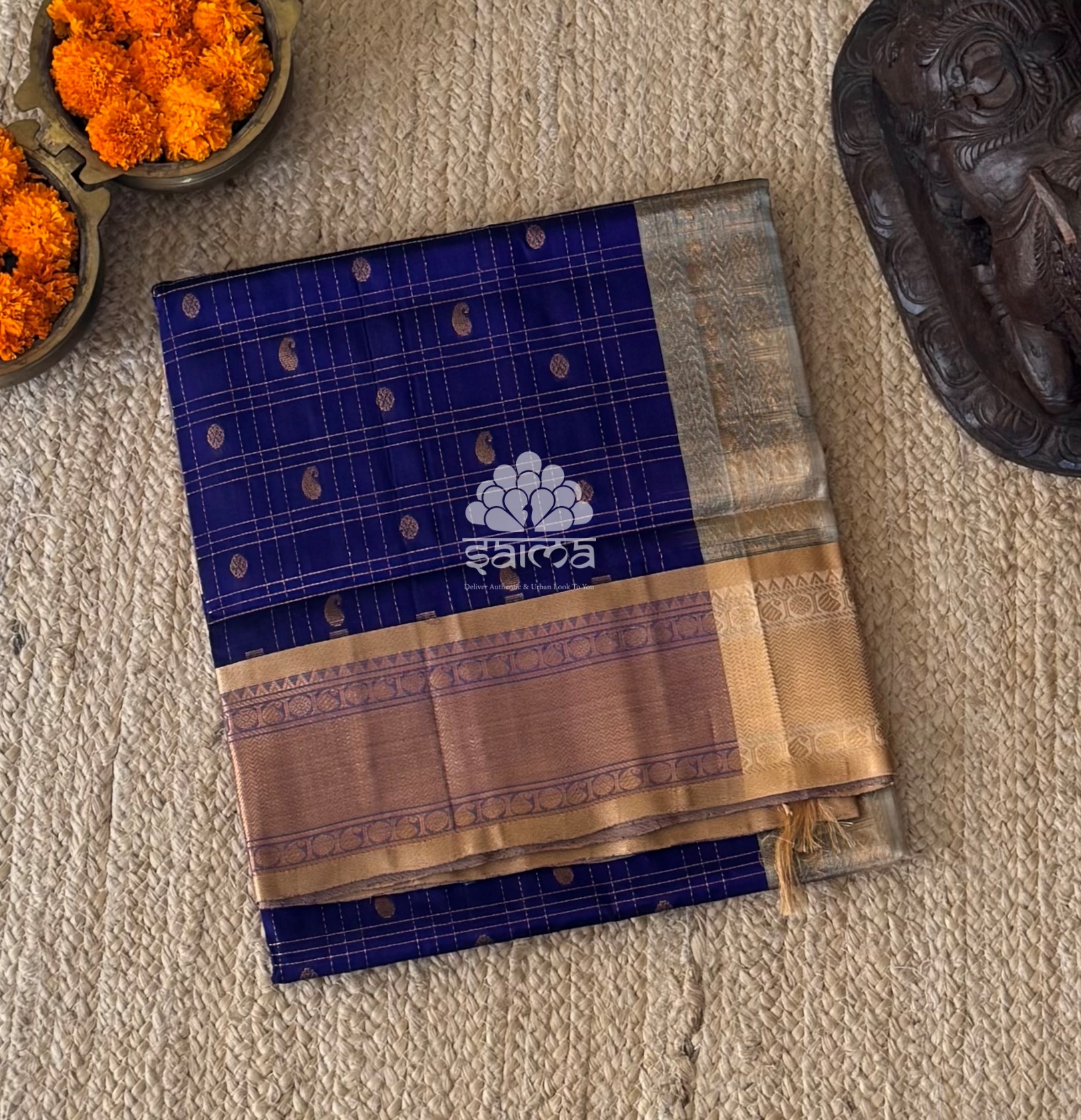 Kanchi silk cotton in ink blue color having thread checks with mango bhuttas design all over the saree and simple design border. Pallu and blouse in soft light rose beige color.