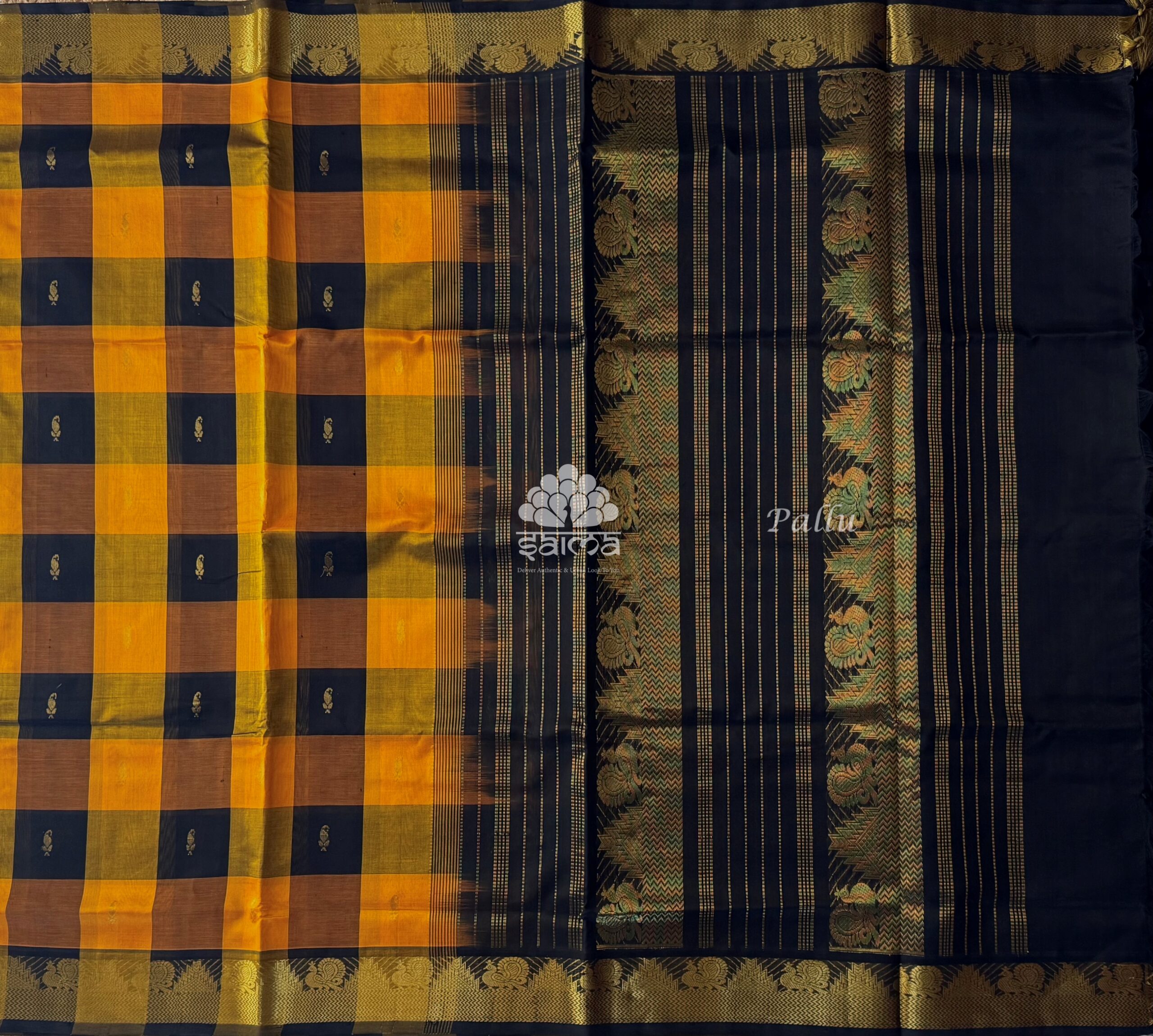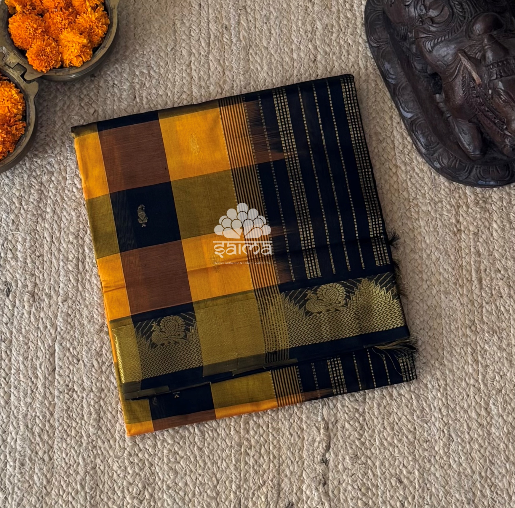 Kanchi silk cotton in pazhum pazhumum design in yellow and black combo color having small bhuttas all over the saree and annapakshi design border. Pallu and blouse in black color.